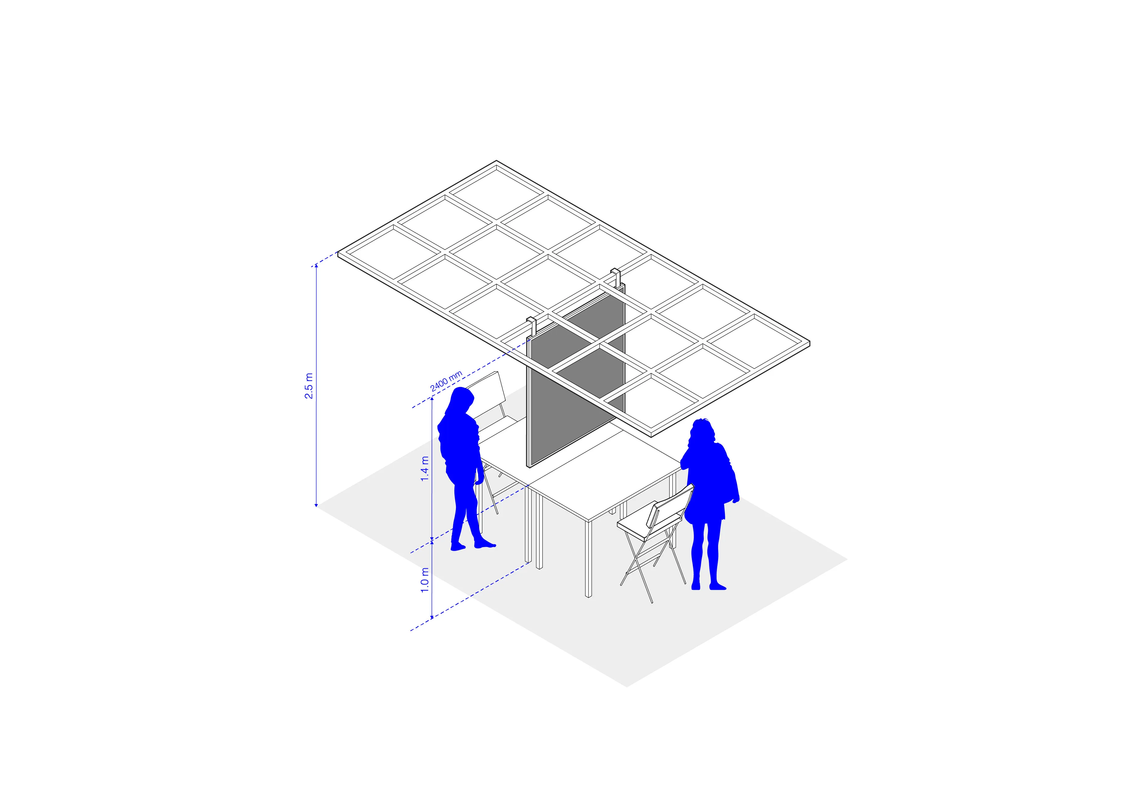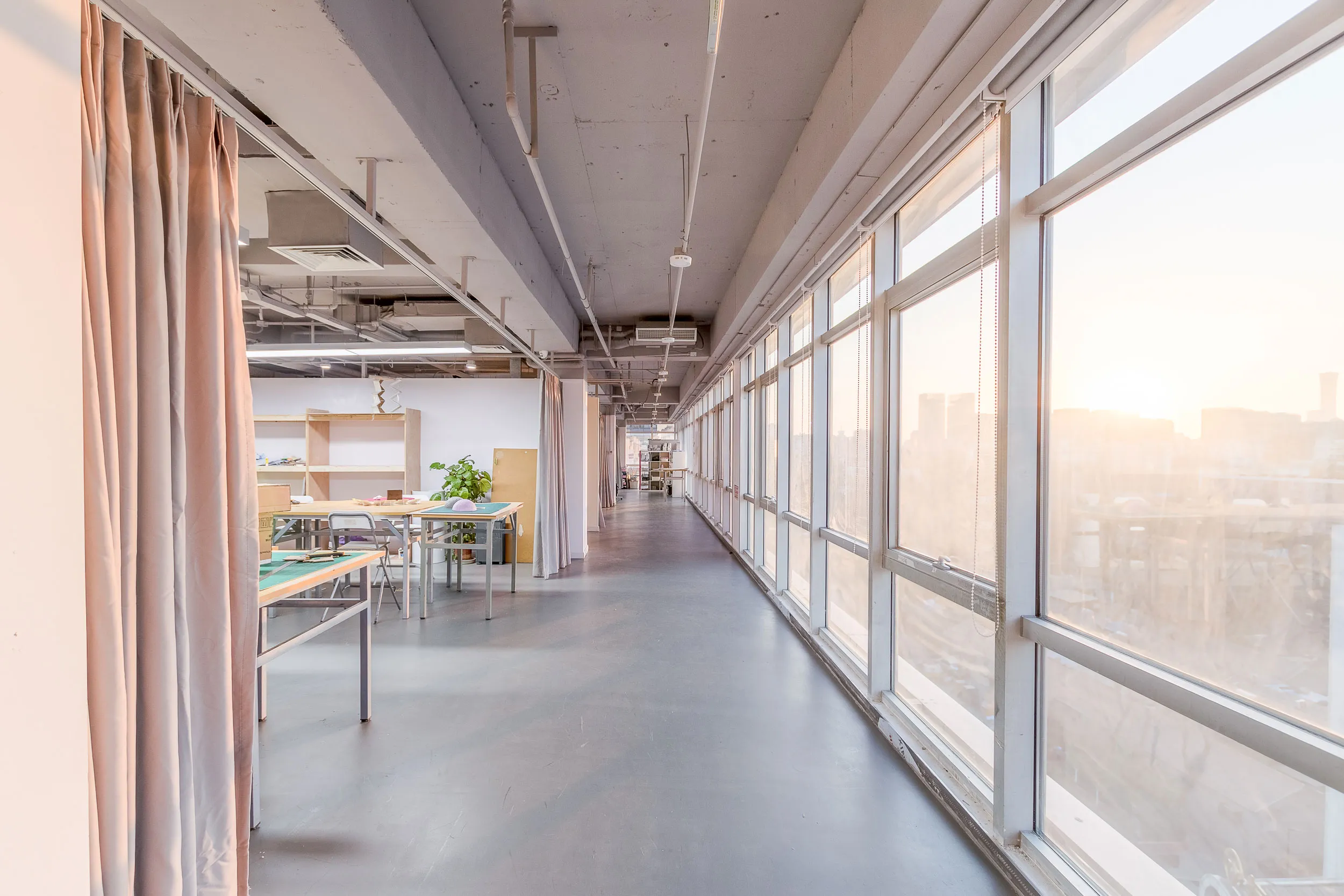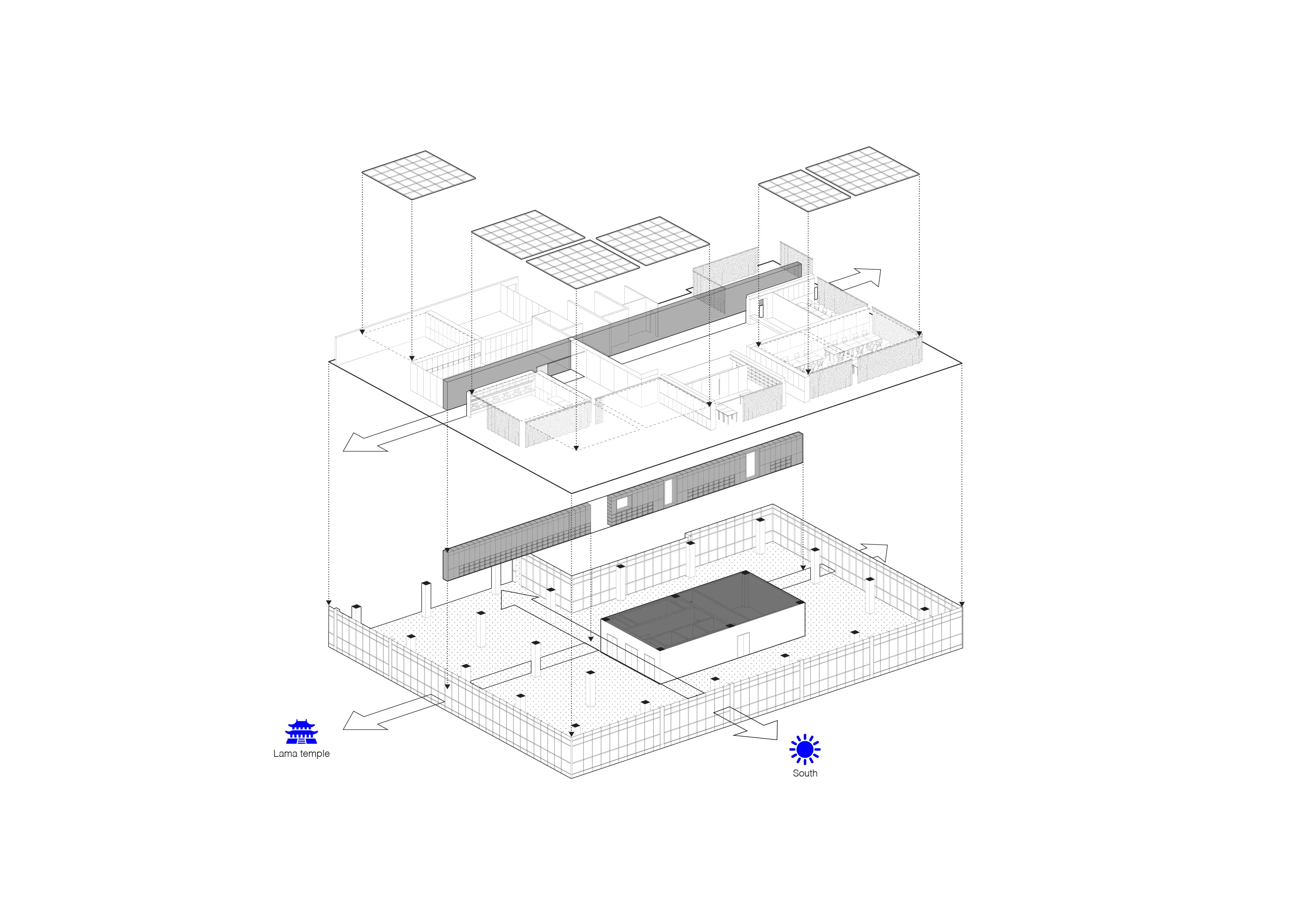 By placing the corridor at the façade, more daylight will enter the building. At the same time, it reduces the impact of direct sunlight to the studios during Beijing’s warm summer months. The studio rooms can be isolated from the ‘promenade’ for private classes by large curtains that substantially help to reduce noise interference. Program that might cause sound disturbance or toxic smells will be located in enclosed boxes.