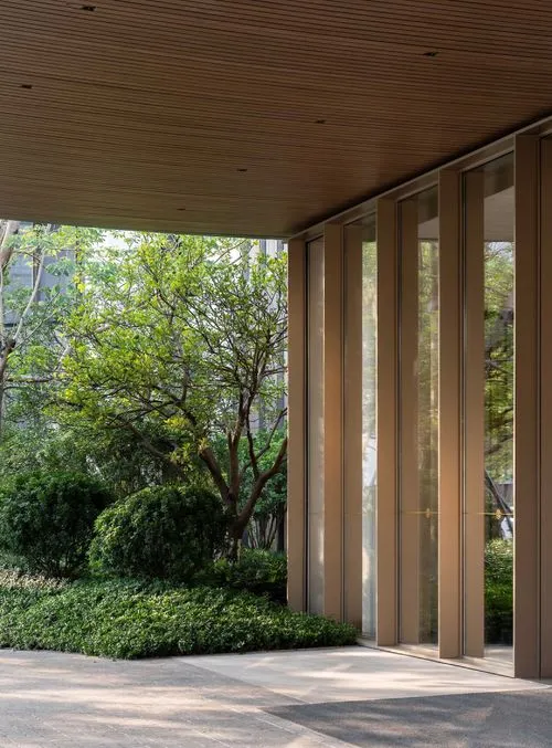 The entrance areas of the development reference the drop-off zones of luxury boutique hotels. A 5 meter high and 7meter cantilevered canopy - drawing inspiration from the curving rooflines of Guangzhou’s ancient architecture - with a wooden board underside provides a warm welcome home to residents. This canopy is supported by a 'forest' of small columns that appear to 'flow' into a small pond beneath.