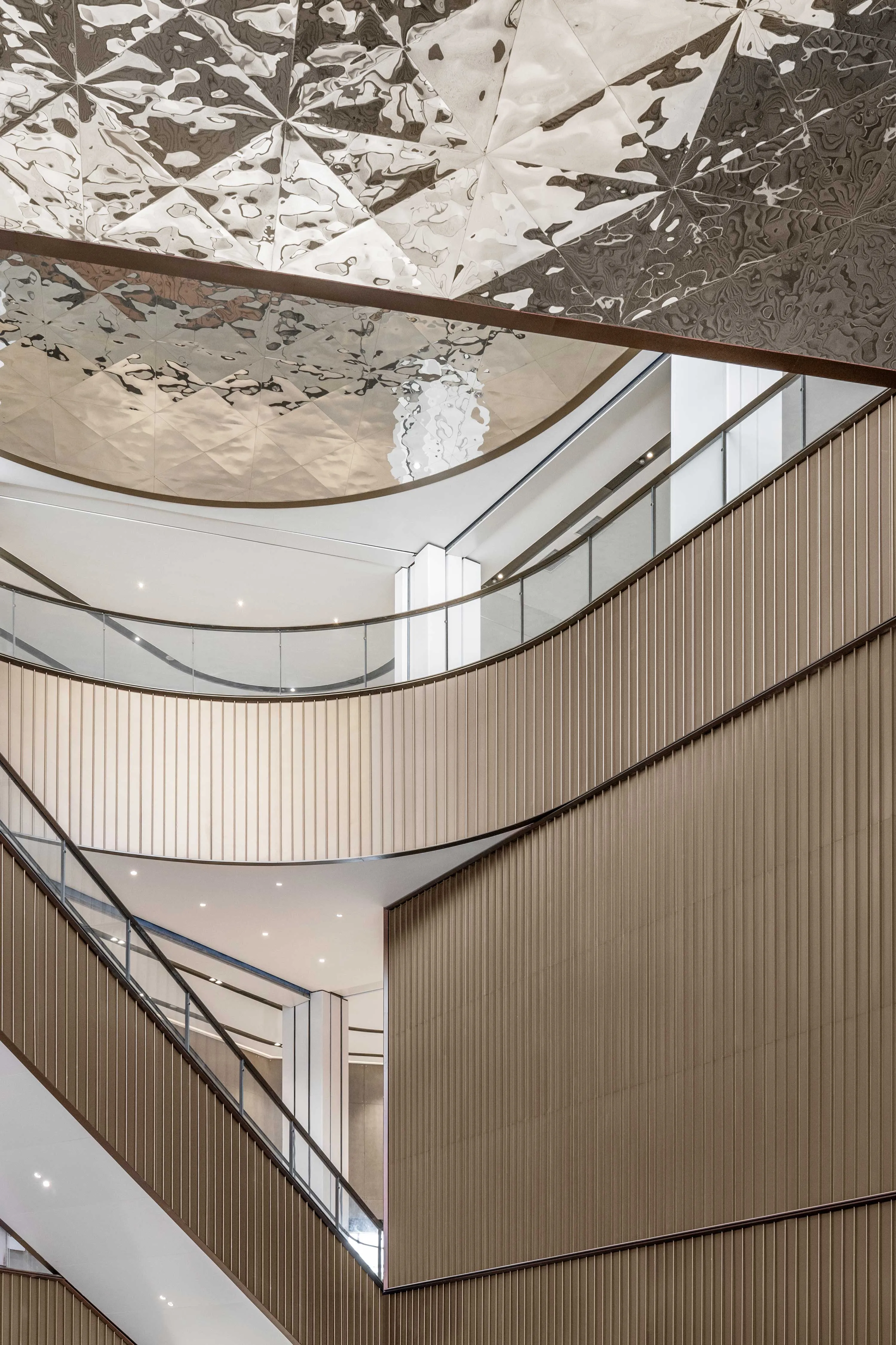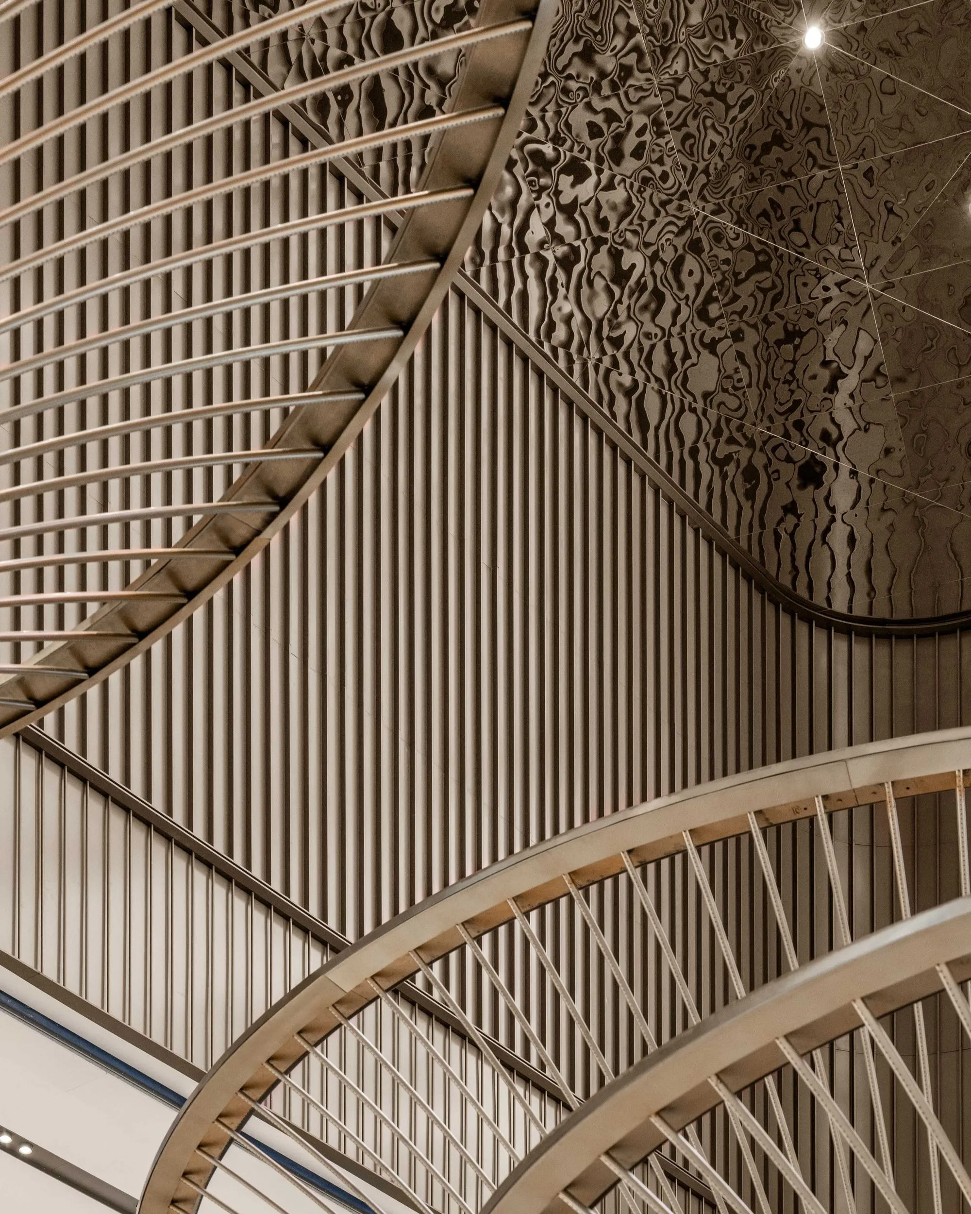 The commitment to a nature-inspired concept extends to the floor patterns - drawn from the natural world- on all levels, reinforcing the 'Community Oasis' theme. Moreover, the ceiling of the atrium is cladded with dented stainless steel panels, strategically positioned to create a scattered reflection of light throughout the space. This design element mimics the dappled sunlight filtering through leaves in a forest, infusing the atrium with a dynamic play of light and shadow.