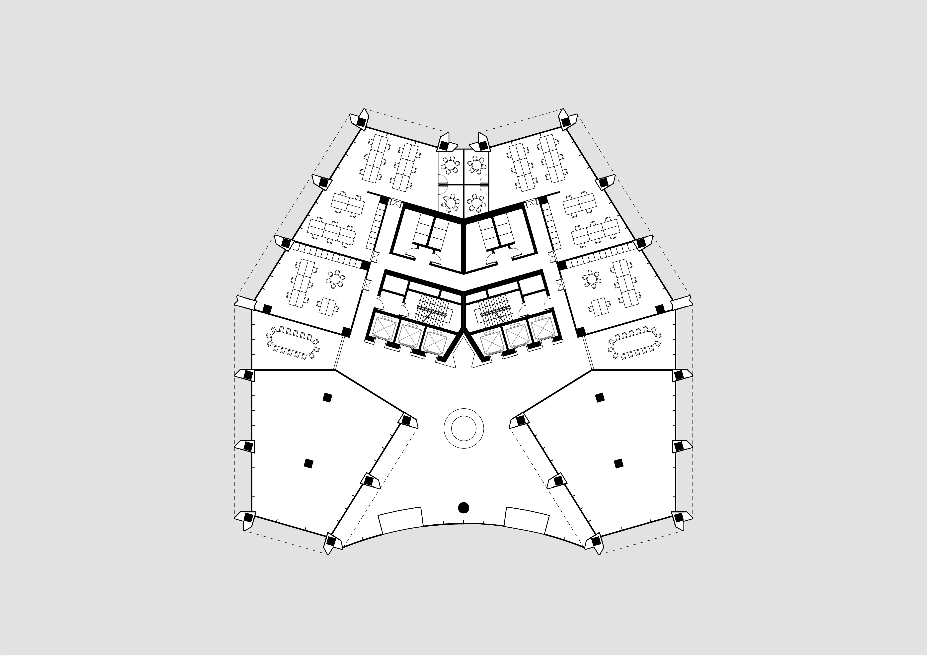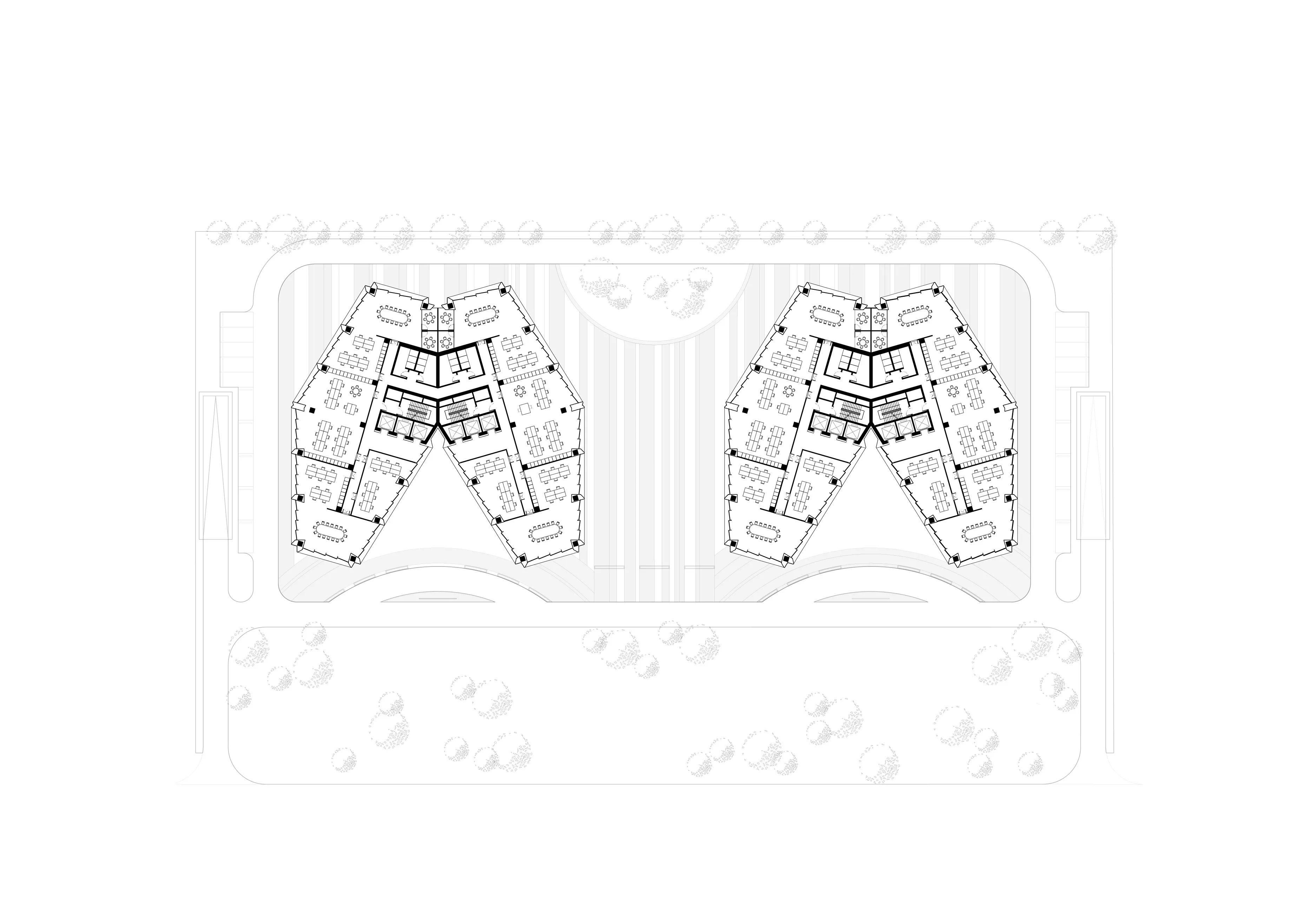 Superimpose suggested to physically combine the four towers to two sets of two merged towers. The diamond-shape plan allows for a better spacing between the different towers, which increases privacy and improves the views from inside out. Furthermore, the tapering of the plan creates a slim appearance of the development towards the main street and the river with a recognizable street interface and identity for each the four companies. The massing strategy also decreases the amount of fire-climbing zones needed and makes double use of escape staircases and MEP shafts to increase the efficiency of each floor plate.