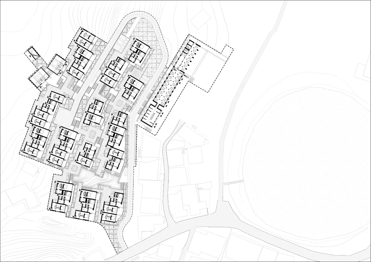 Most of the abandoned structures could unfortunately not bereused after going through years of decay. Superimpose looked for the better-maintained structures to save them from demolition and transform theminto public amenity buildings with a restaurant, gym, swimming pool, yogastudio and mountain library. Furthermore Superimpose used the existingvillage footprint to develop a 41-unit B&B masterplan. The masterplan is designed in such a way that it respects the mountain landscape and resembles characteristics of the once thriving village. The masterplan layout integratedvillage squares and small alleys that were once vital for the communityatmosphere.