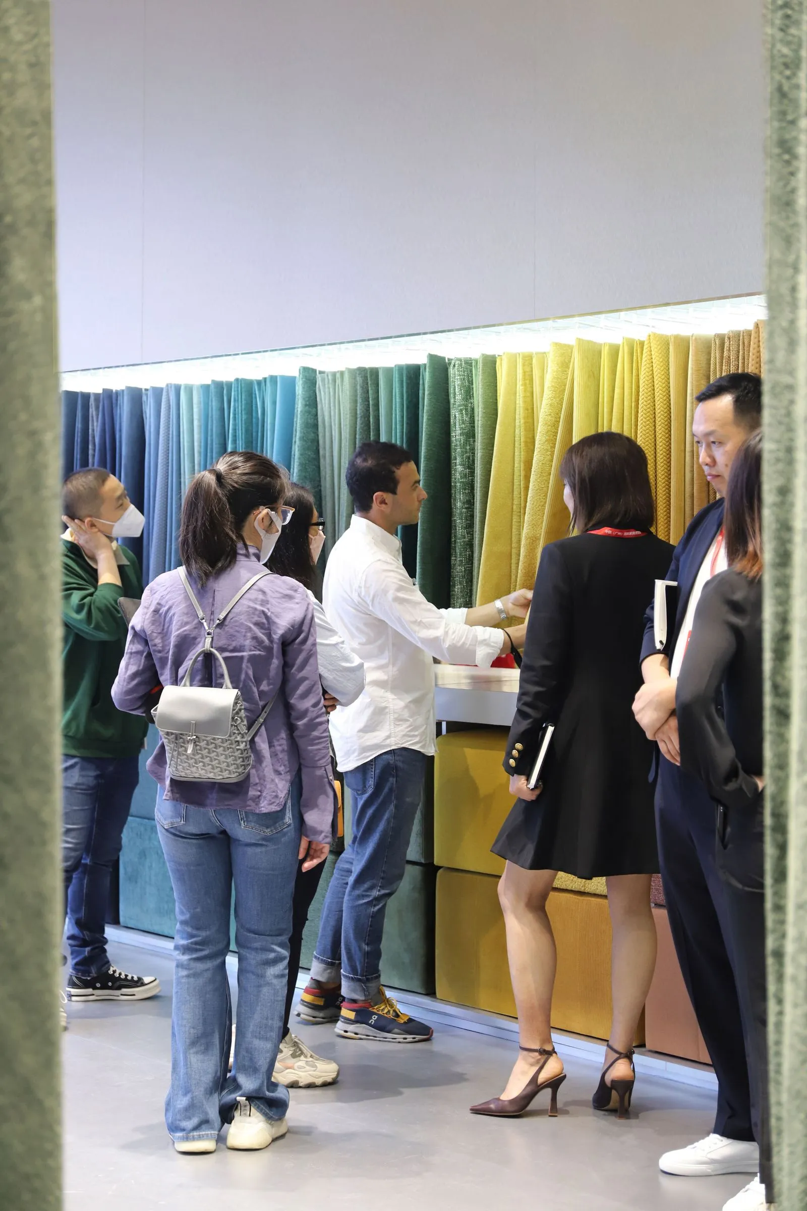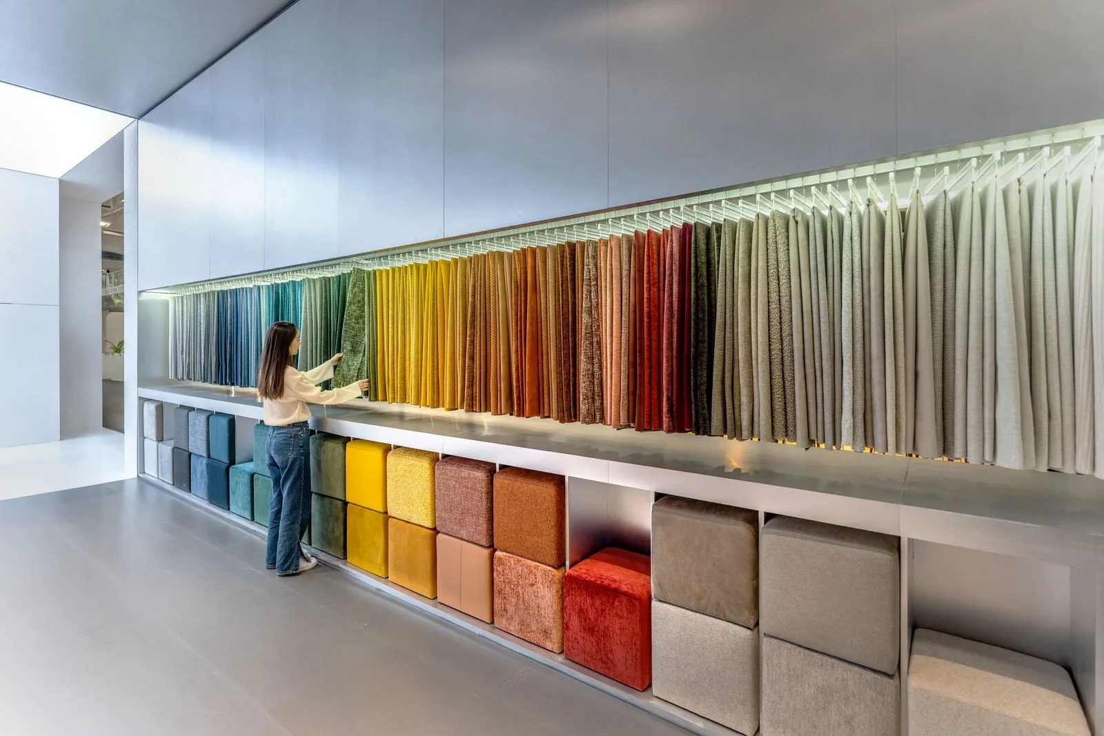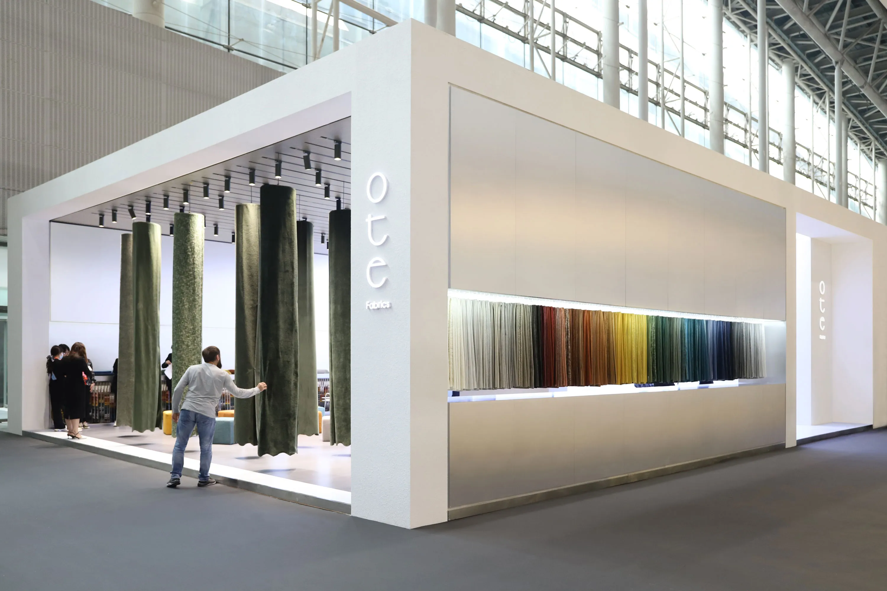 For the Shanghai-based upholstery manufacturer and supplier OTE Fabrics, Superimpose designed an immersive, partly reusable and adaptable pavilion for the Guangzhou Furniture fair, that invites potential customers to actively get in touch with their fabrics.