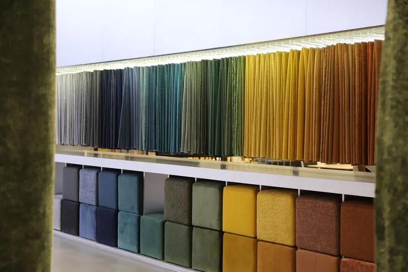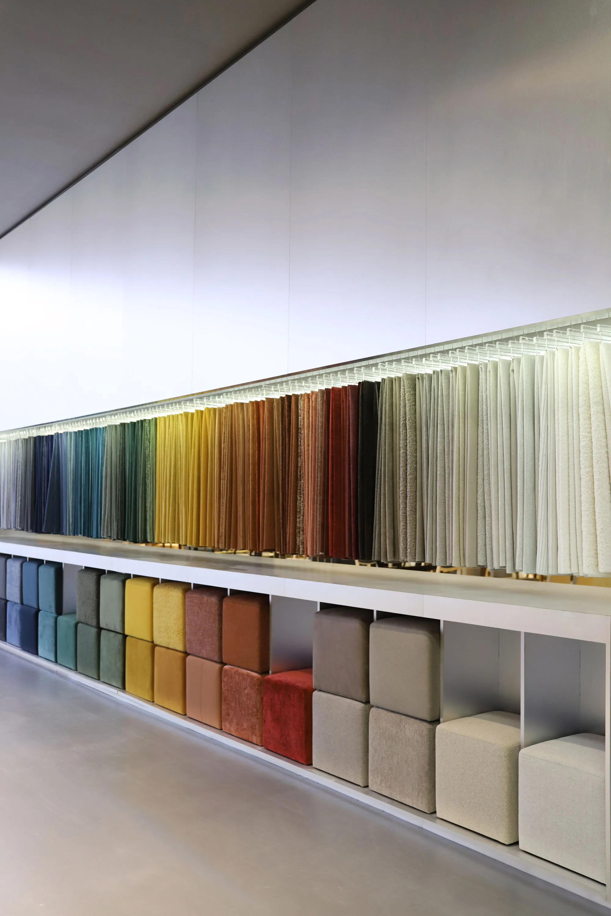 At the right-hand side of the temporary pavilion, the fabrics are hung with acrylic hangers, and arranged in a gradient colour pattern, allowingthe customer to quickly find the colour they might be looking for. The cabinet underneath provides storage space for colourful small stools that can be usedin the pavilion in case of talks and other events. At the other side of the pavilion, fabrics are placed flat and folded, to give the customer the possibility to take out the fabric easily. In the cabinet underneath, smaller sample boards provide customer to further discover the OTE’s wide range of products.
