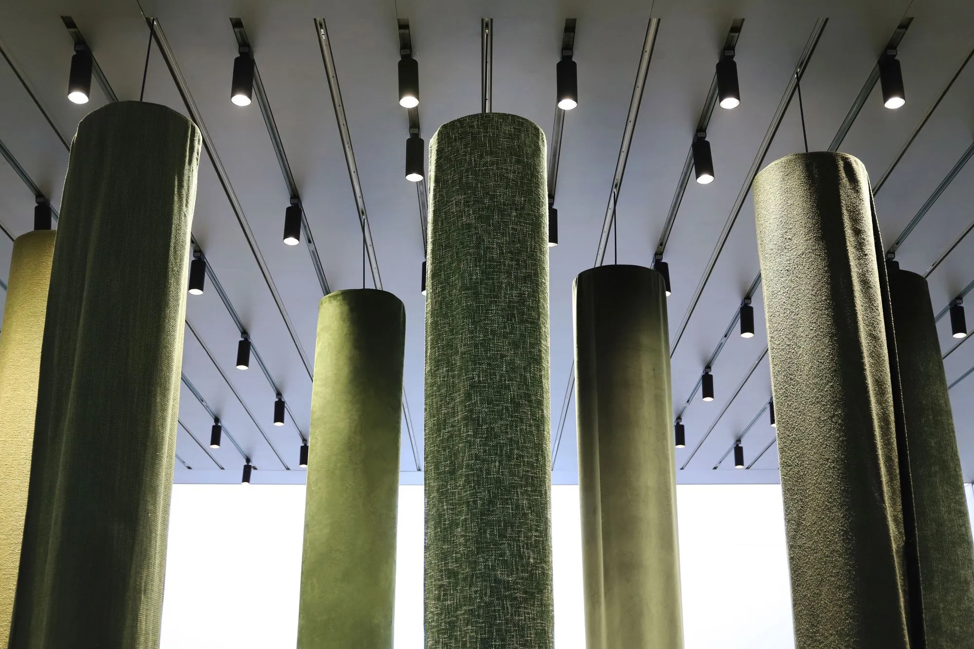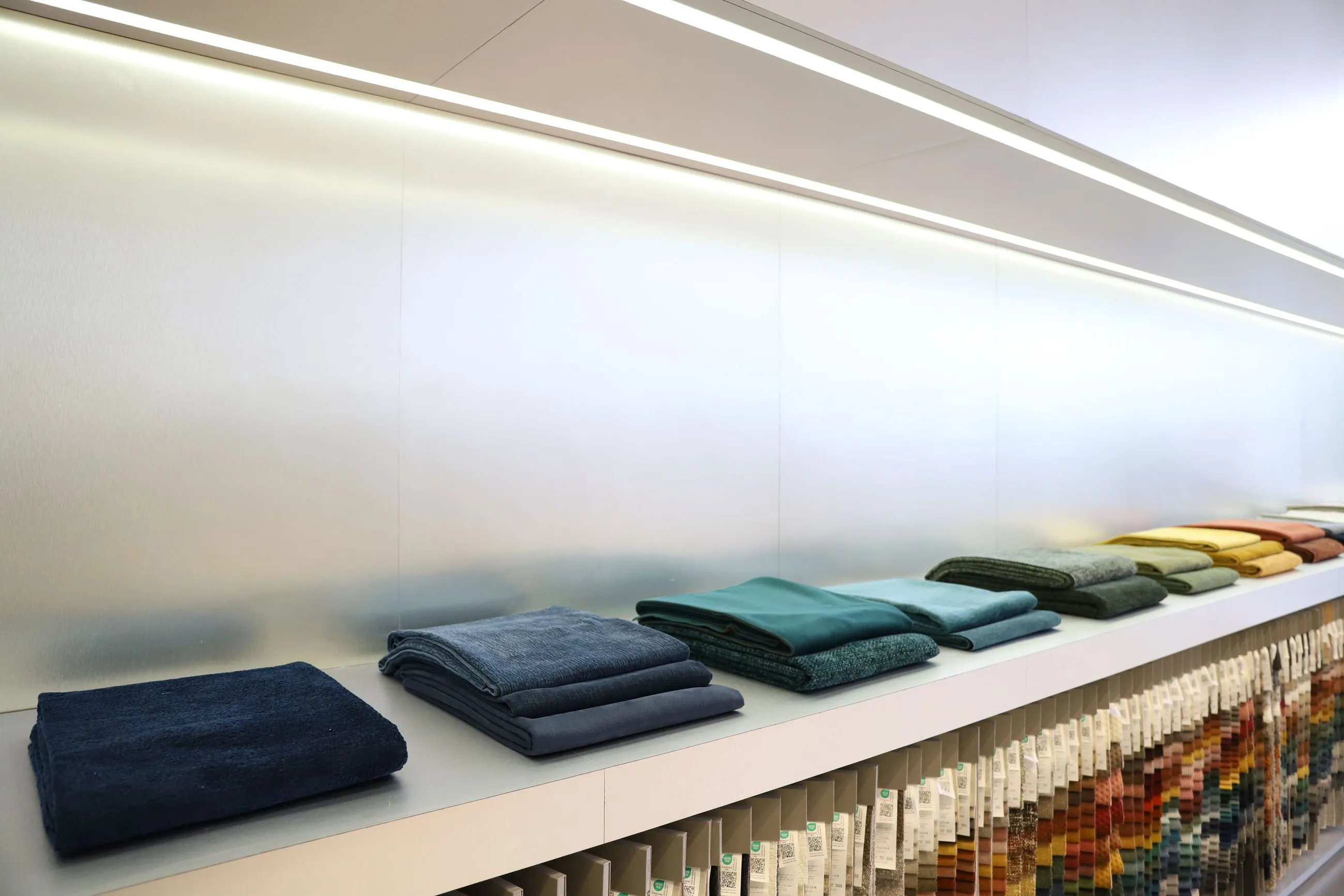 The overall spatial planning of the pavilion is clearly split into three zones: a front display area, back sales area, and storage space. The front display area provides a large and adaptable open space which can be used for events. ‘Floating’ pieces of fabric act as an attractor and can be moved all the way to the front of the pavilion in case of events, or dispersed throughout the space during regular hours. These floating pieces of fabrics give the customer the opportunity to wander through and examine, inspect and appreciate the materials closely. At the back part of the pavilion, meeting tables and a small pantry are located. An LED screen is integrated in the fabric back-wall to display promotional videos. A stretch-fabric ceiling with LED lights provides acoustic comfort and artificial ‘daylight’ to the otherwise dark space.