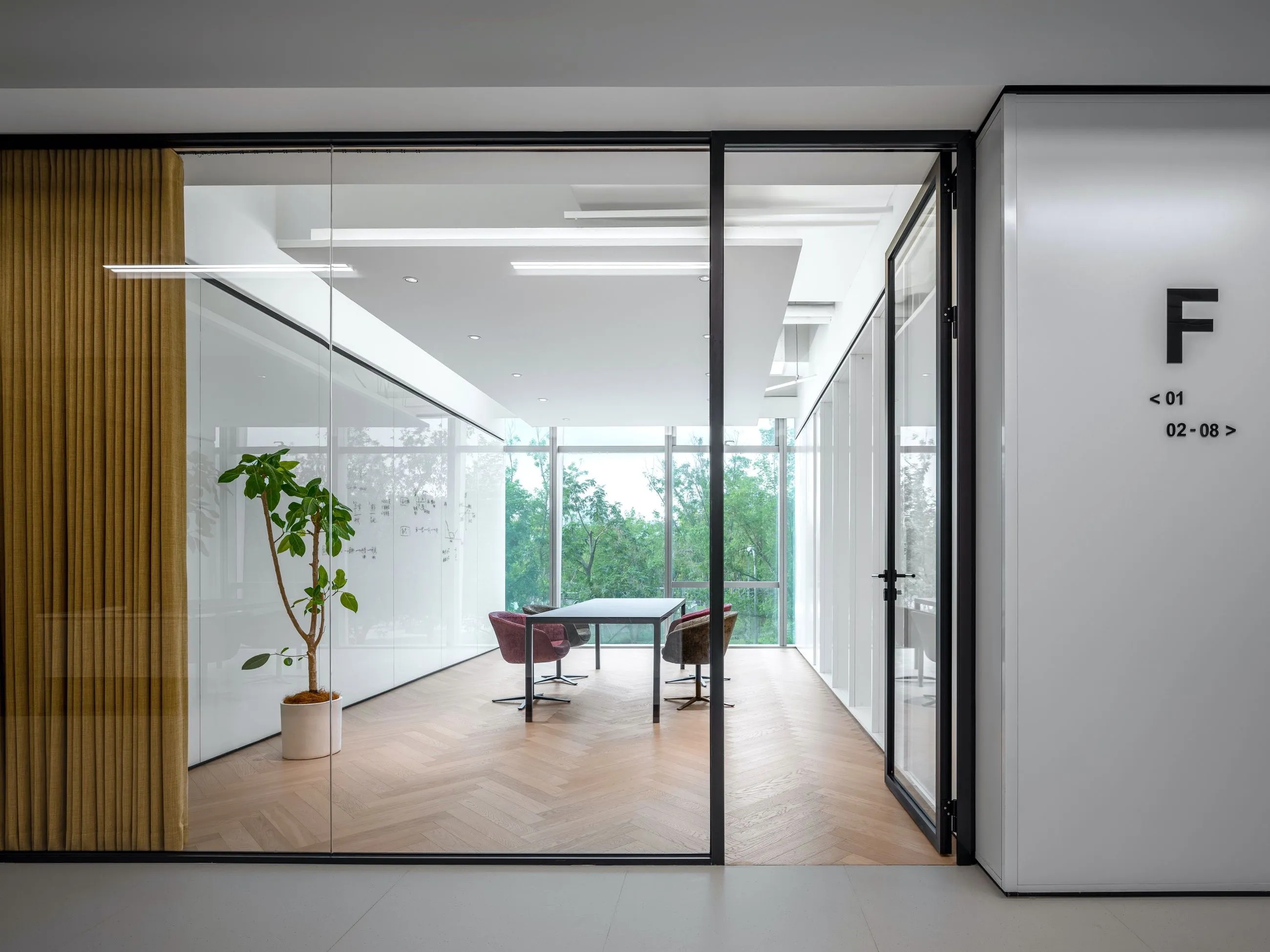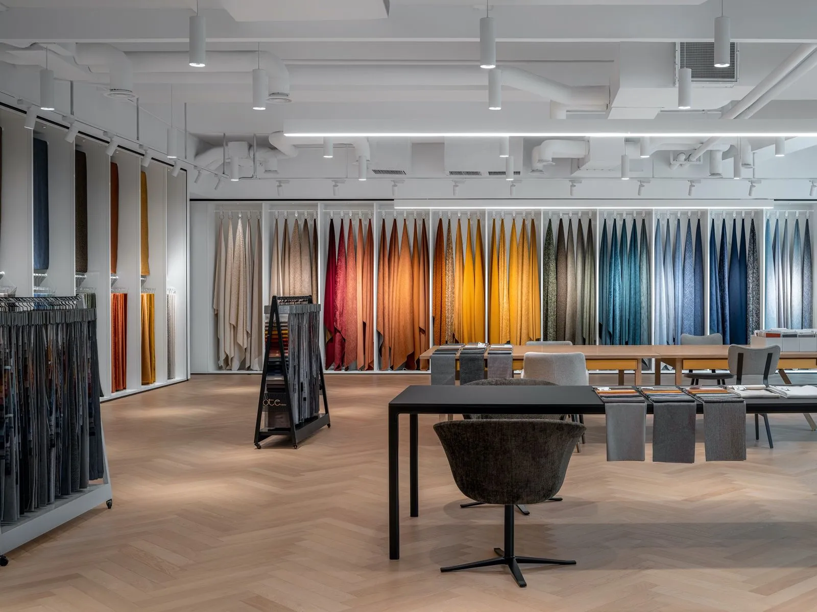 The interior boosts light materials and colors to reflect the daylight into thedeep floor plate, but also to provide a calm backdrop to the displayed fabrics.The cabinets are detailed in such a way that it looks like they are placed inlater and can be removed again. The use of large amounts of glass provides openness and sense of modernity to the space. Behind the glass, the client’s curtains are used to improve acoustics and privacy when needed. The light fixtures and numbering on the cabinets add refer to the client’s warehouses.