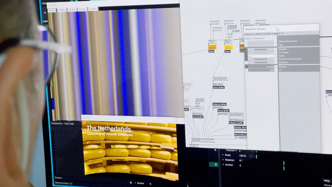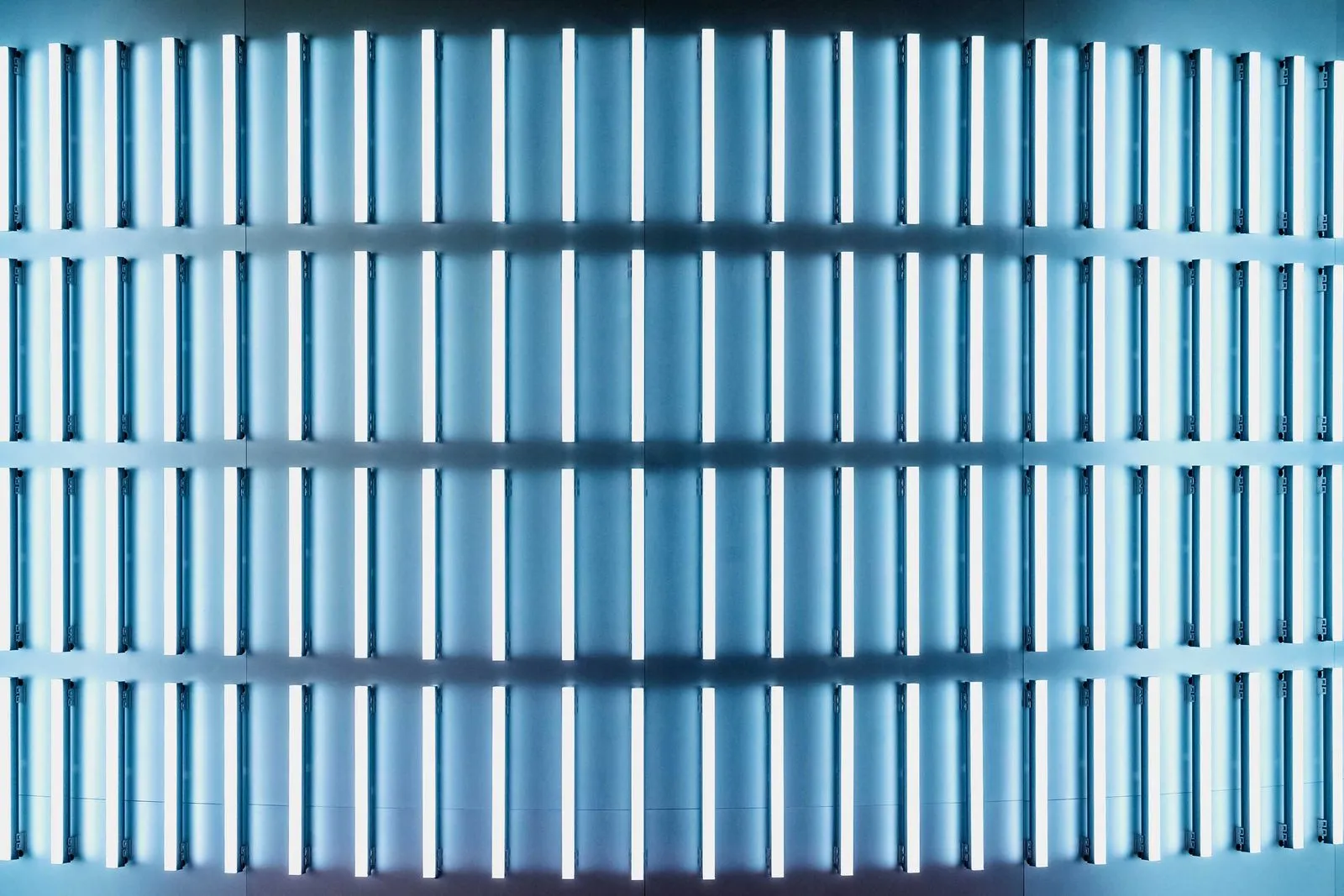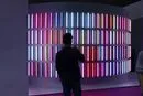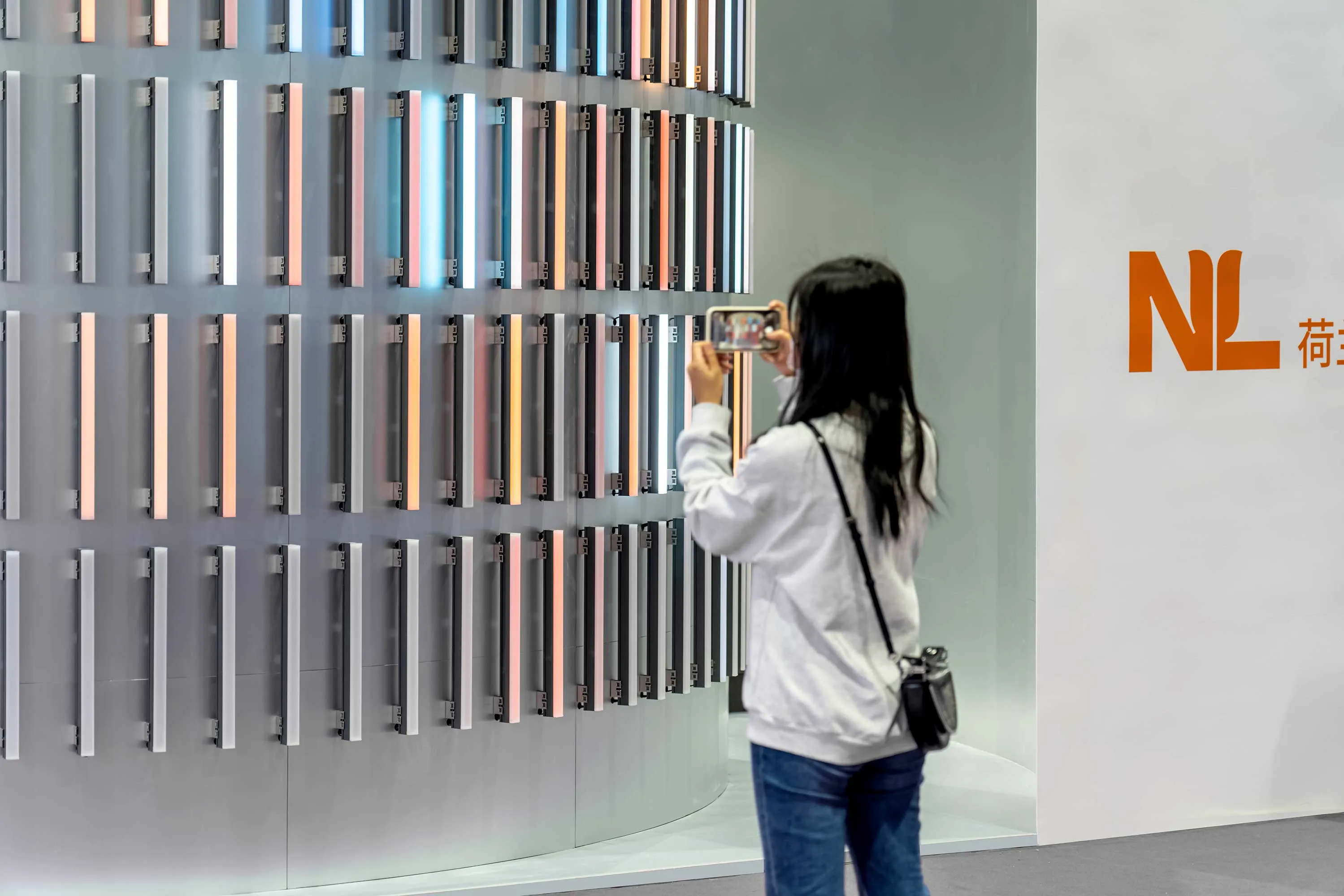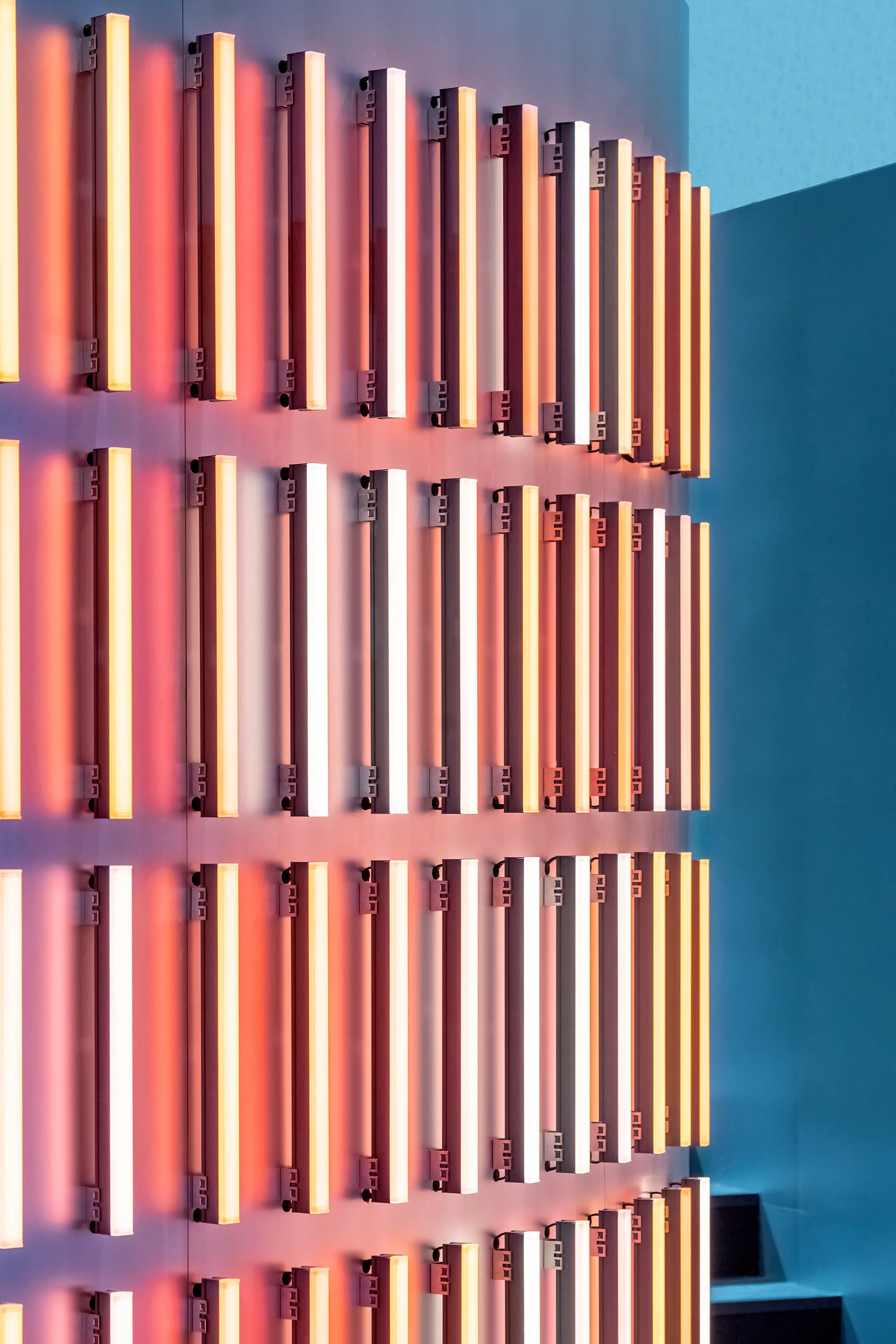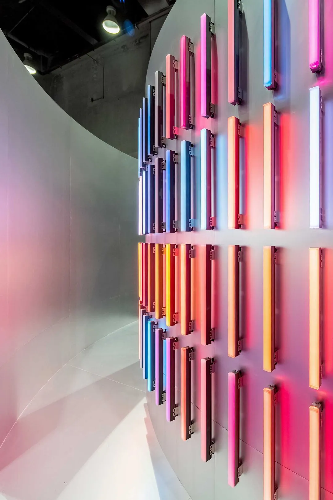 In order to attract visitors into the booth through the power of color, 124 linear LED light fixtures arranged in 4 horizontal bands are mounted to the exterior of semi-circular wall. The horizontal bands are an abstract representation of the typically colorful Dutch flower fields. Multimedia designer Shard Island developed an interactive script for the pavilion lights. When there is an event happening in the pavilion, it directly converts real-time presentations into abstract colors through the LED lights on the exterior curved wall. This innovative representation is achieved by streaming the presentations through a wireless transmission system and with advanced interactive multi-media technology.
