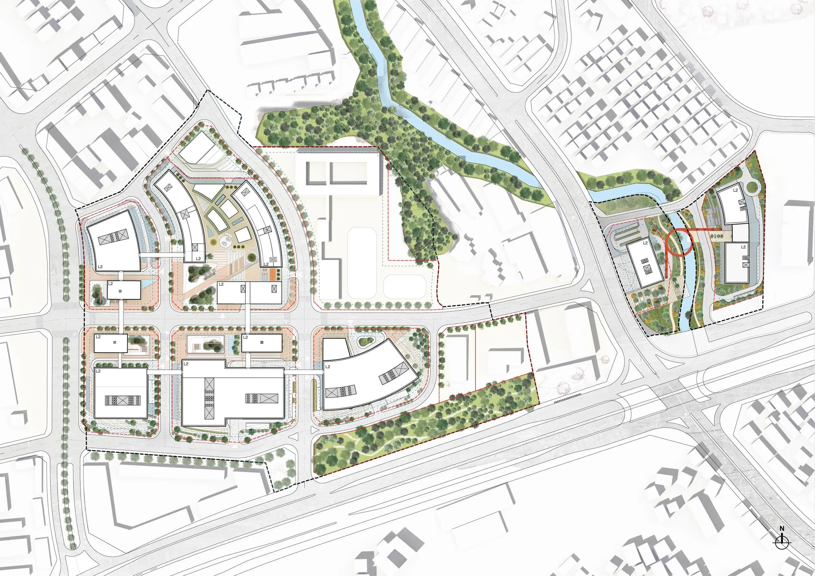 Superimpose proposed a human-scale ‘R&D Campus’ for a mixed-use masterplan of a former factory area in Chinese mega-city and tech-hub Shenzhen. The development will be mostly focused on three main functions: industry, R&D, and office. The development will also integrate supporting retail, a residential area, dormitories, sports facilities, kindergartens, and parks. The masterplan will be a transit-oriented development (TOD), connecting to a subway station and intercity bus station.