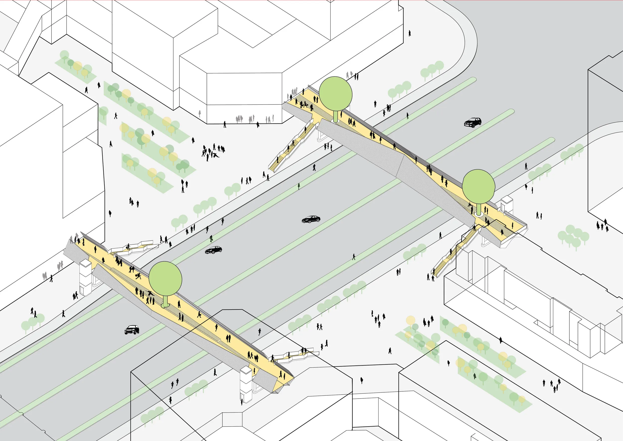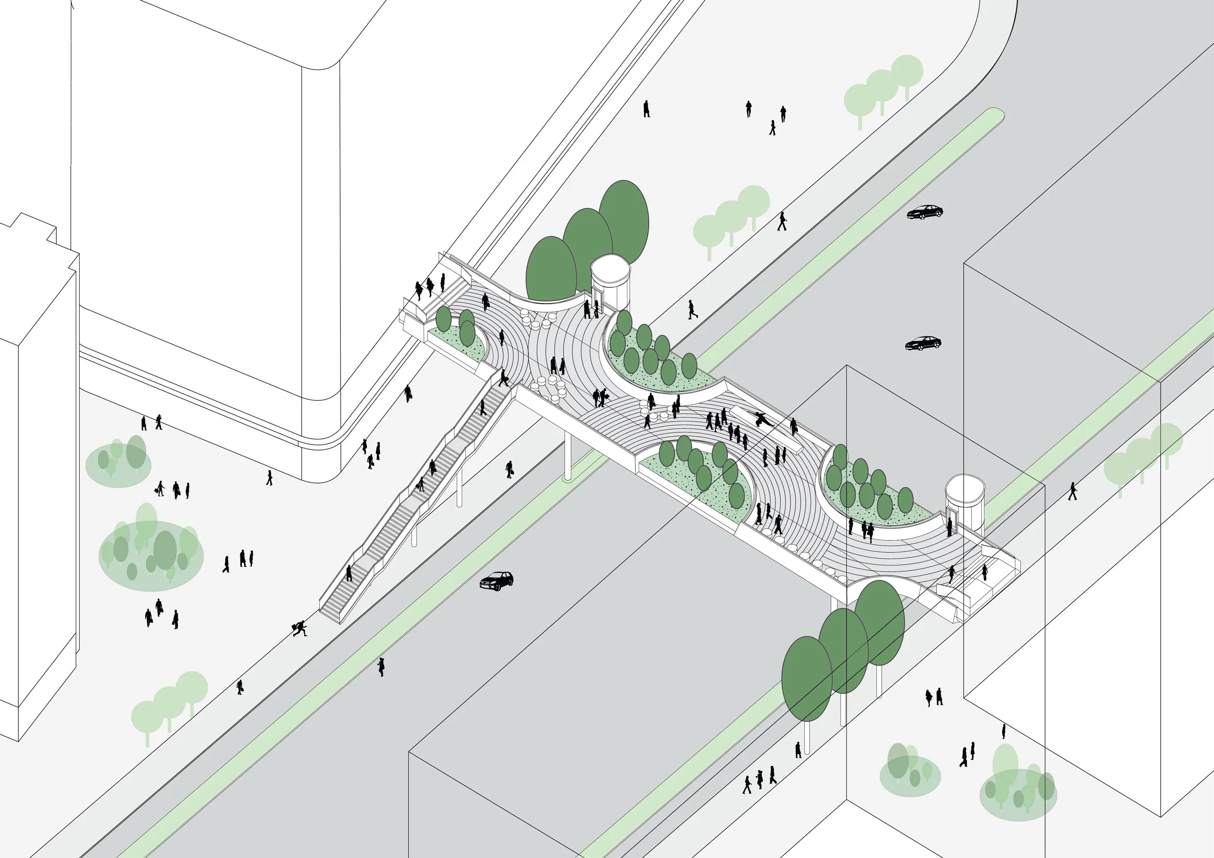 The bridge groups have different designs but share simple structural and circulation principles, keeping the project within budget. Every bridge group refers to its own season by unique spatial arrangement, circulation strategy, colors, vegetation typology, materials, and shape. The balustrades of the bridges play a special role in the spatial experience and appearance of each bridge. The bridges’ main purpose is to connect efficiently. Simultaneously they provide places where the people can stay, communicate, enjoy greenery and relax.