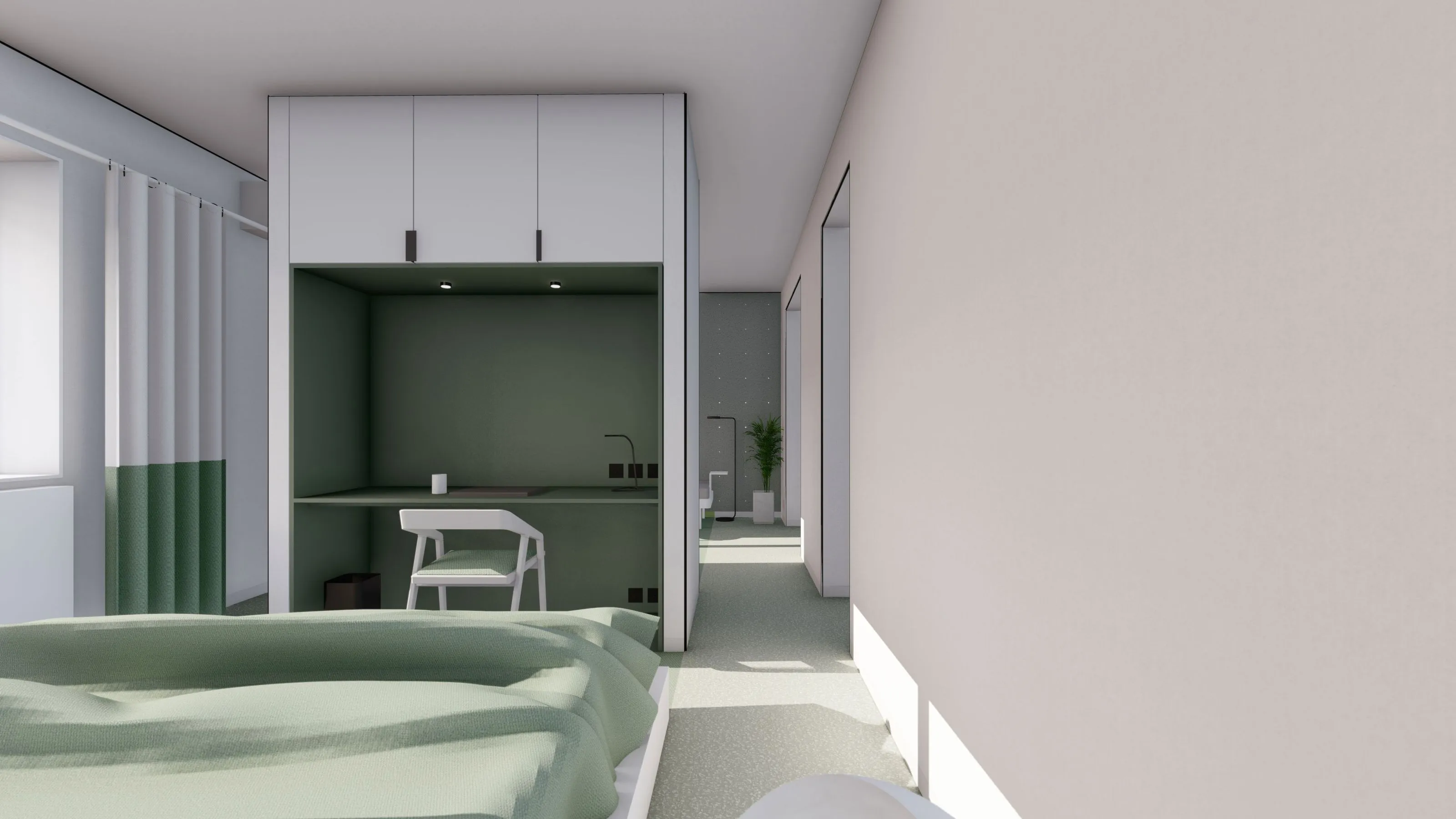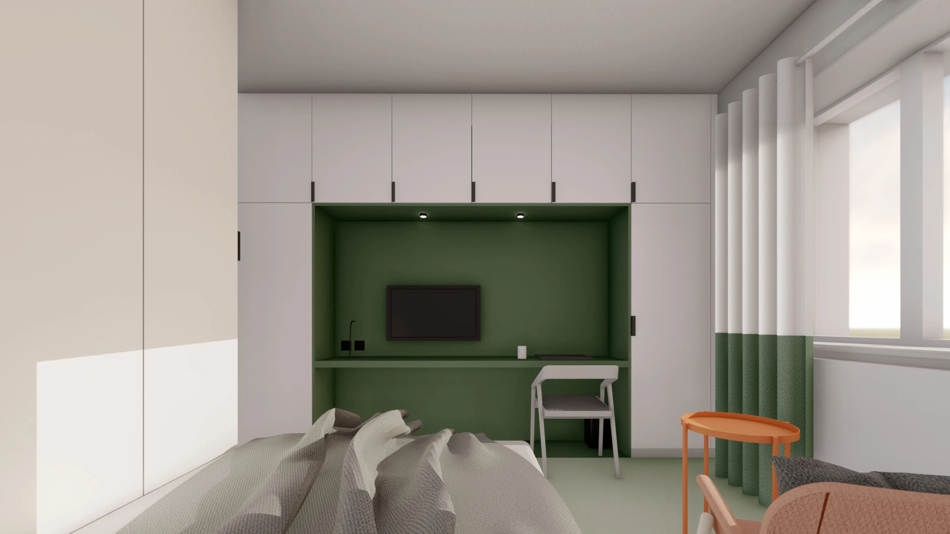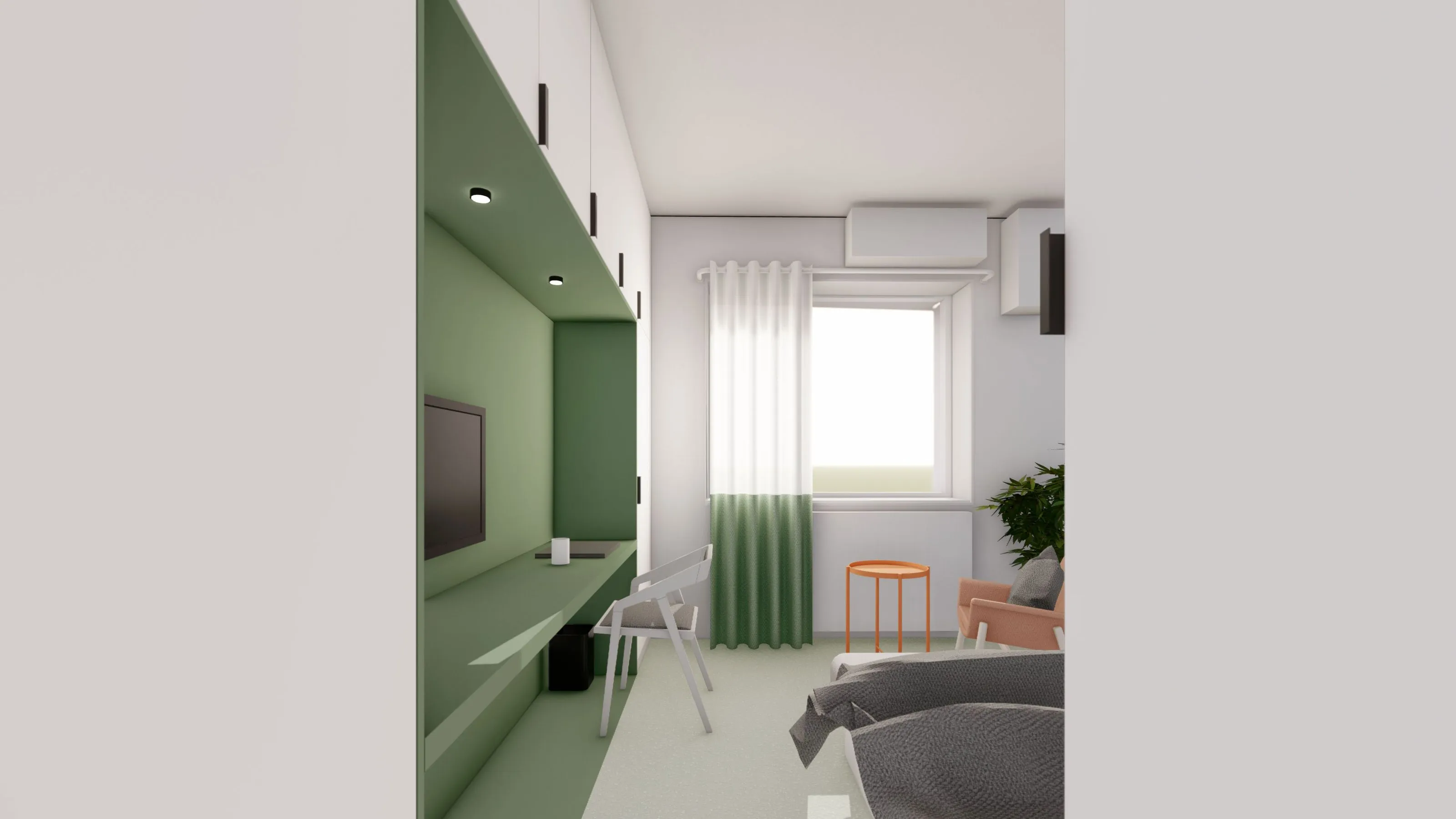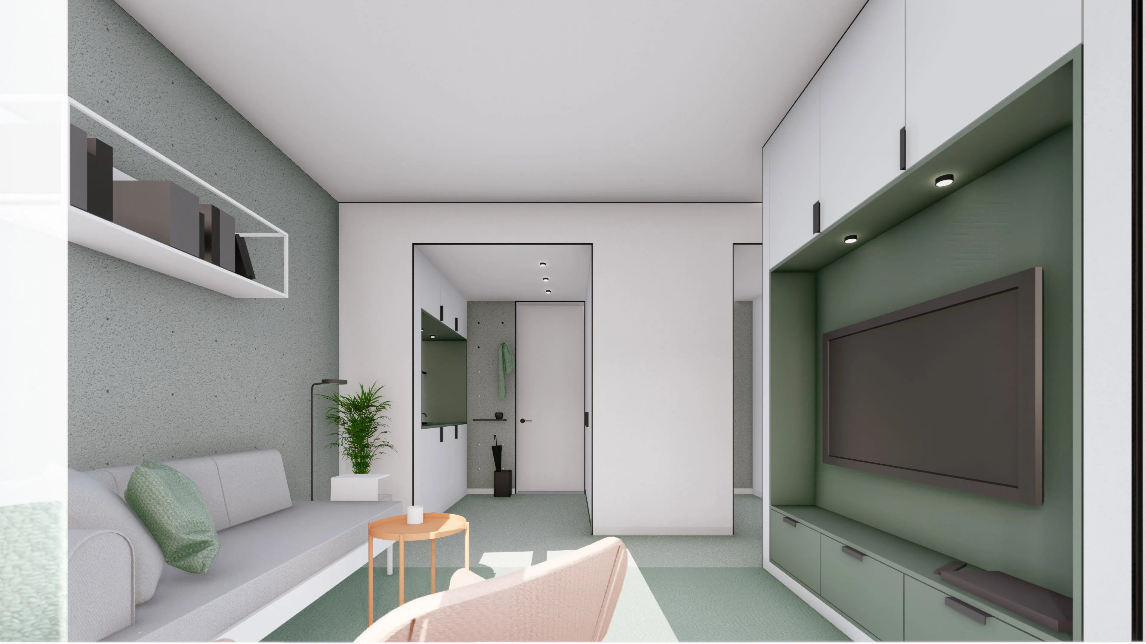 Playfully three-dimensional window-modules with integrated air-conditioning units are applied to the façade to give the façade a young yet organized appearance. The dark grey modules are contrasted with green stucco, which gives the façade a more modern appearance. On the ground floor, the window modules integrate storage space and spans from floor to ceiling providing an abundance of natural daylight to the interior.