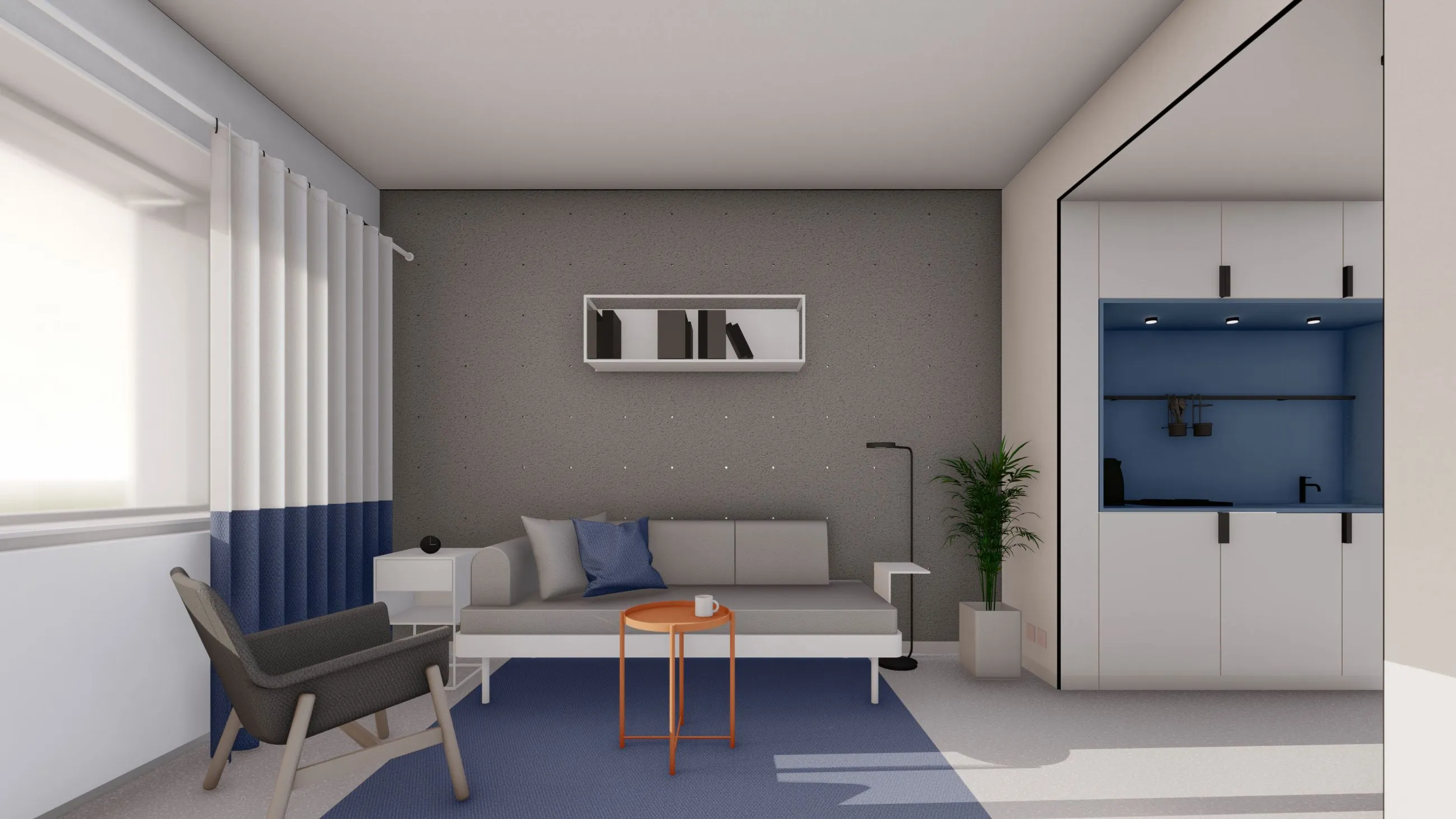 The apartments are designed to provide as much comfort and sense of luxury as possible within a tight space. The fixed wall furniture elements are well considered modules that combine functionality with comfort. A carefully selected color scheme is applied to provide a fresh but cozy look to the interior space.