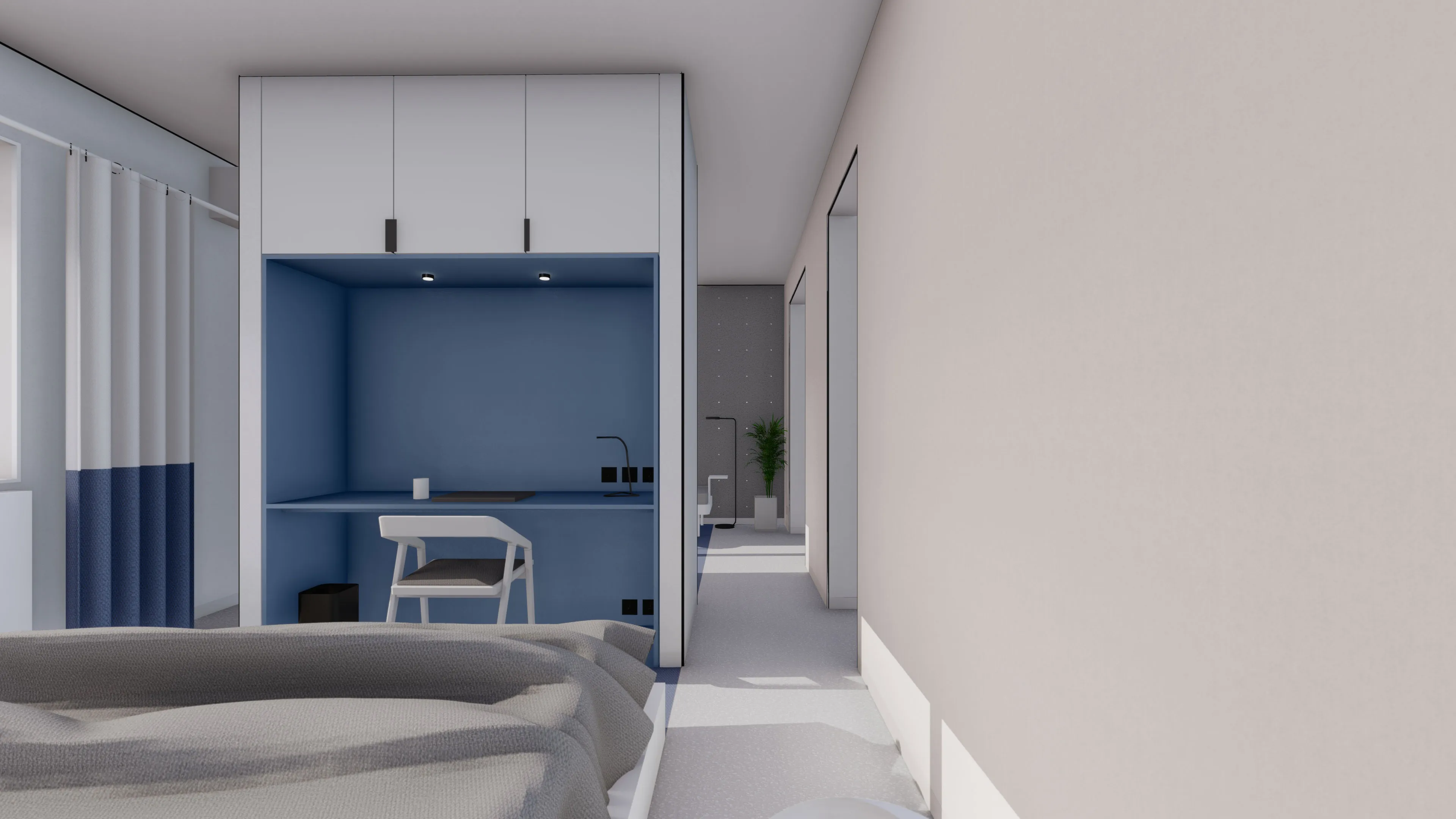 On the ground floor a new corridor along the main façade connects the shared program like a gym, shared living room, dining room, kitchen, library and game room. By positioning the new corridor at the façade instead of in the usual middle of the plan, there will be a better connection between in and outside where there are more shared functions located such as a barbeque, large outdoor dining table, Zen areas and an outdoor gym area. The corridor at the façade also provides more daylight into the otherwise dark spaces.