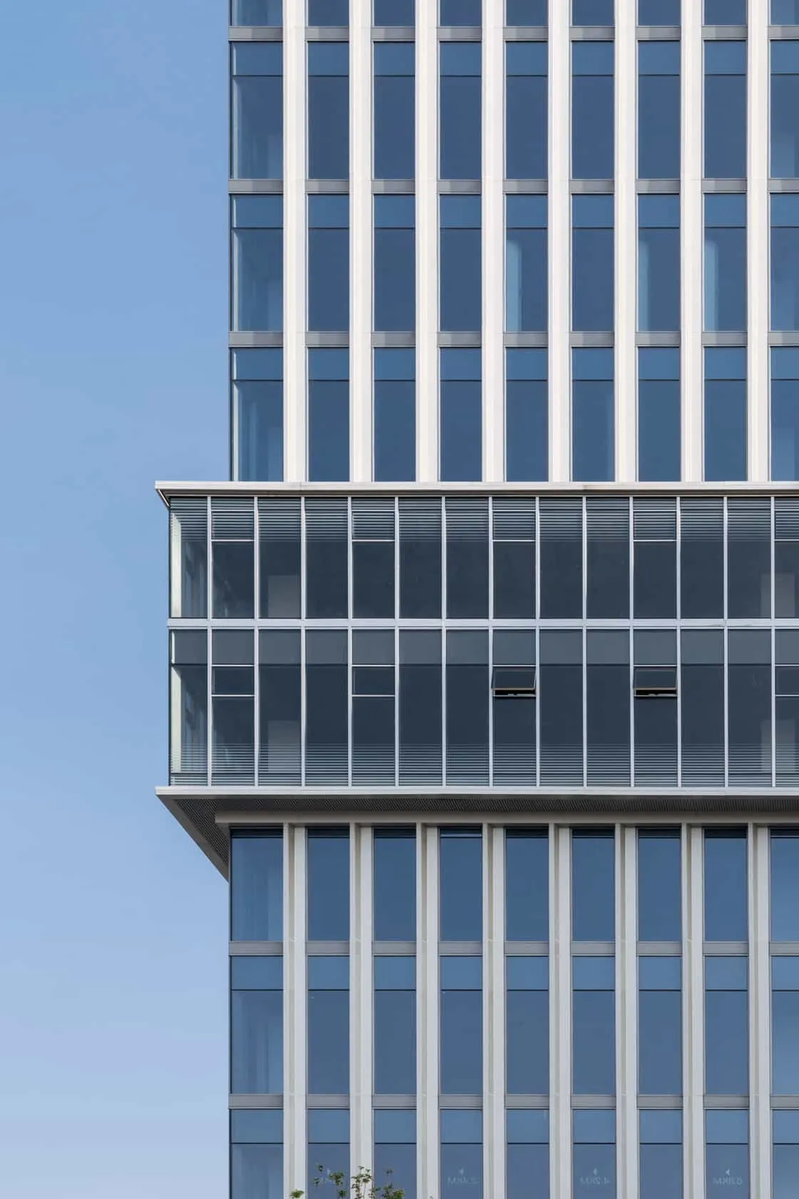 For the ‘Cloud’ Superimpose choose to have a calmer façade approach. The appearance is defined by a repetition of vertical elements. The sealuminum ‘fins’ are perforated and allow for an innovative ventilation concept.The massing of the tower is split in two by a large glass box, to even further break down the massing.