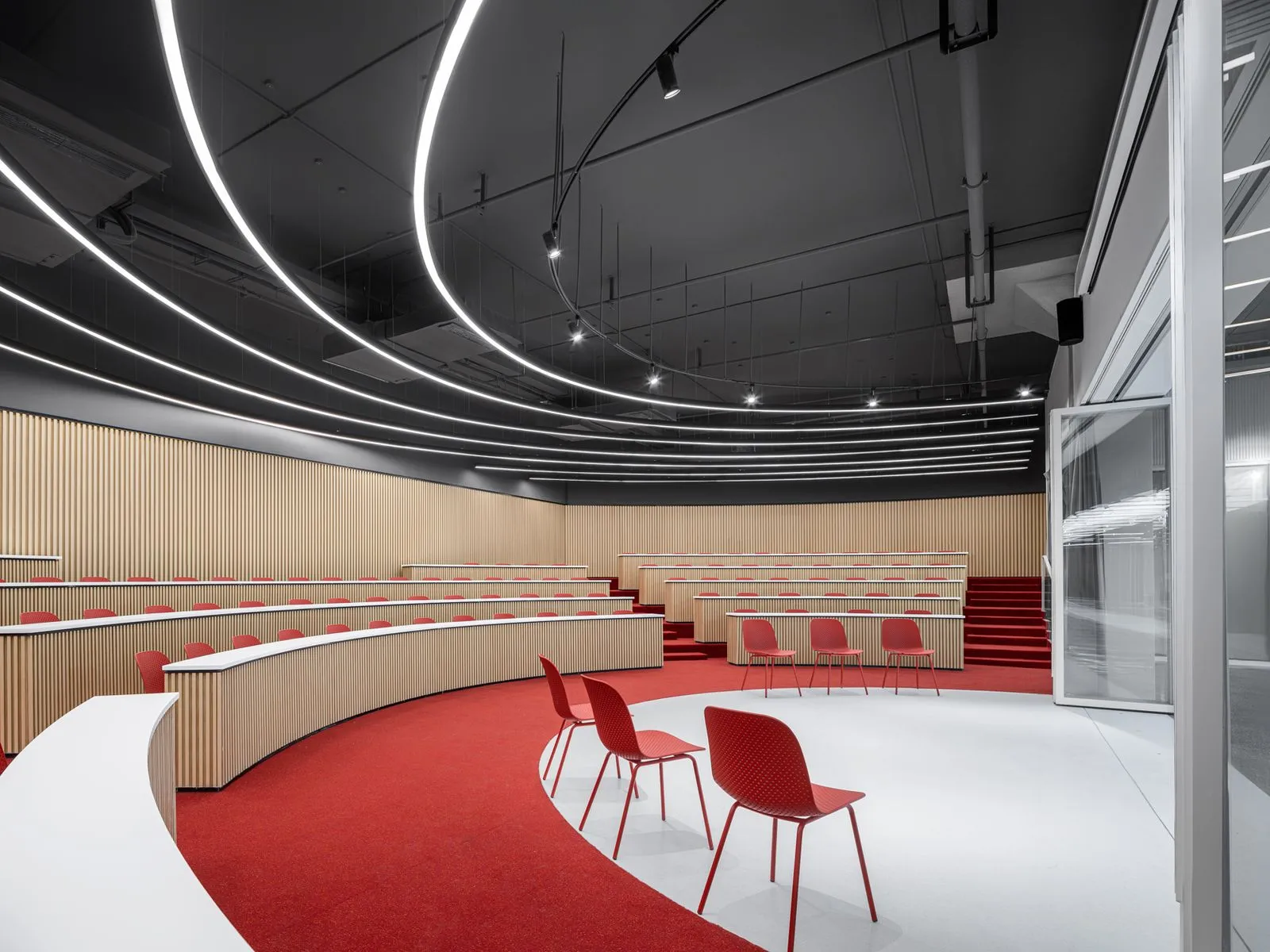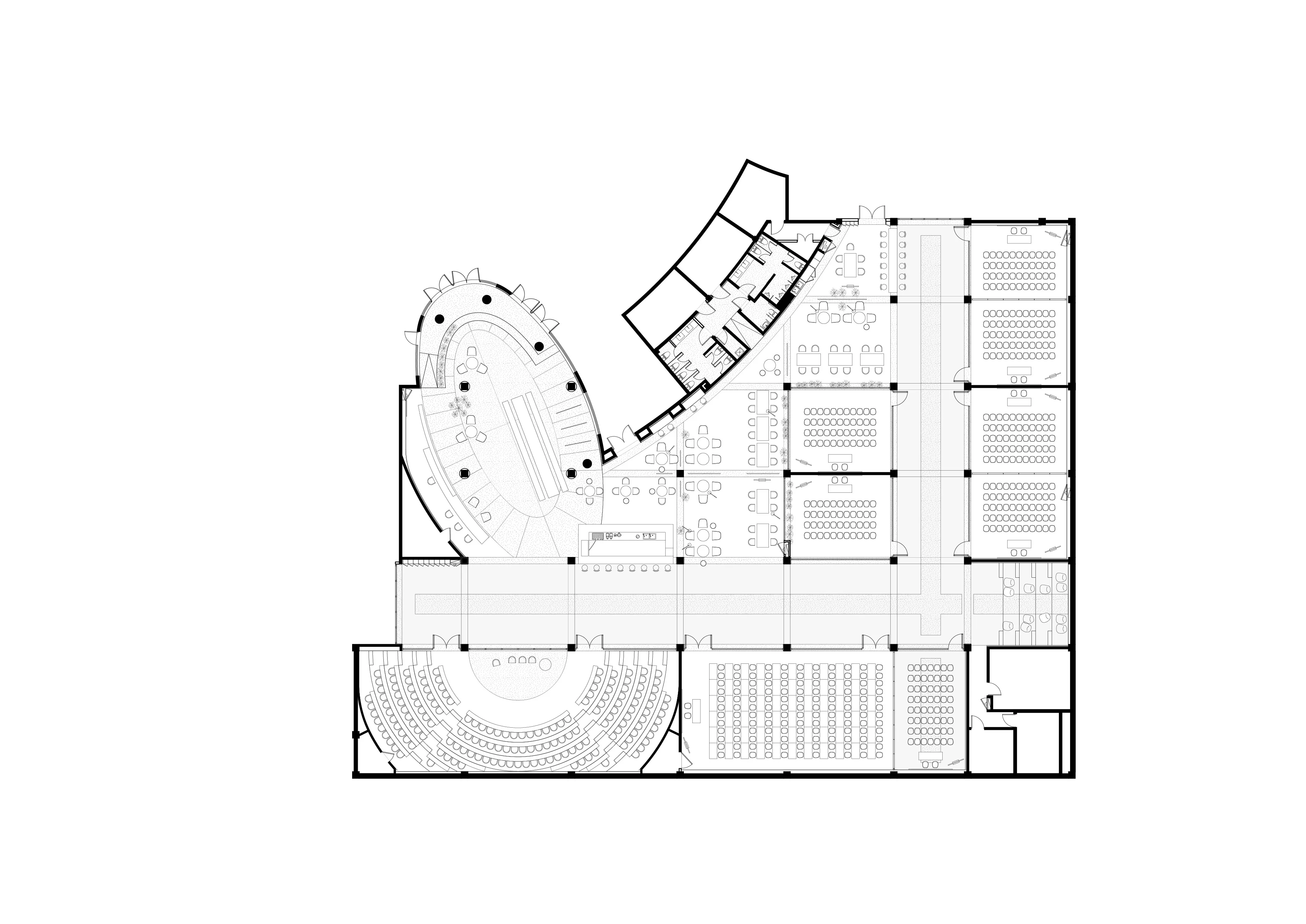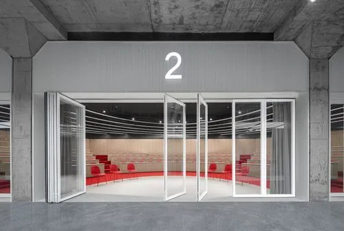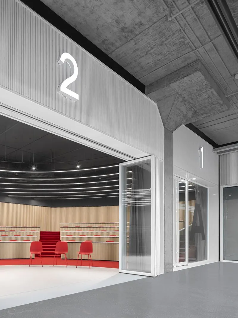 Similar to the typical arcade, façade-like modules are inserted in between the exposed concrete columns of the basement and alongside the arcade. Meeting rooms and auditoriums are located behind those white modules. The module of the auditorium can be fully opened so that the auditorium can be expanded or become part of the reception area.