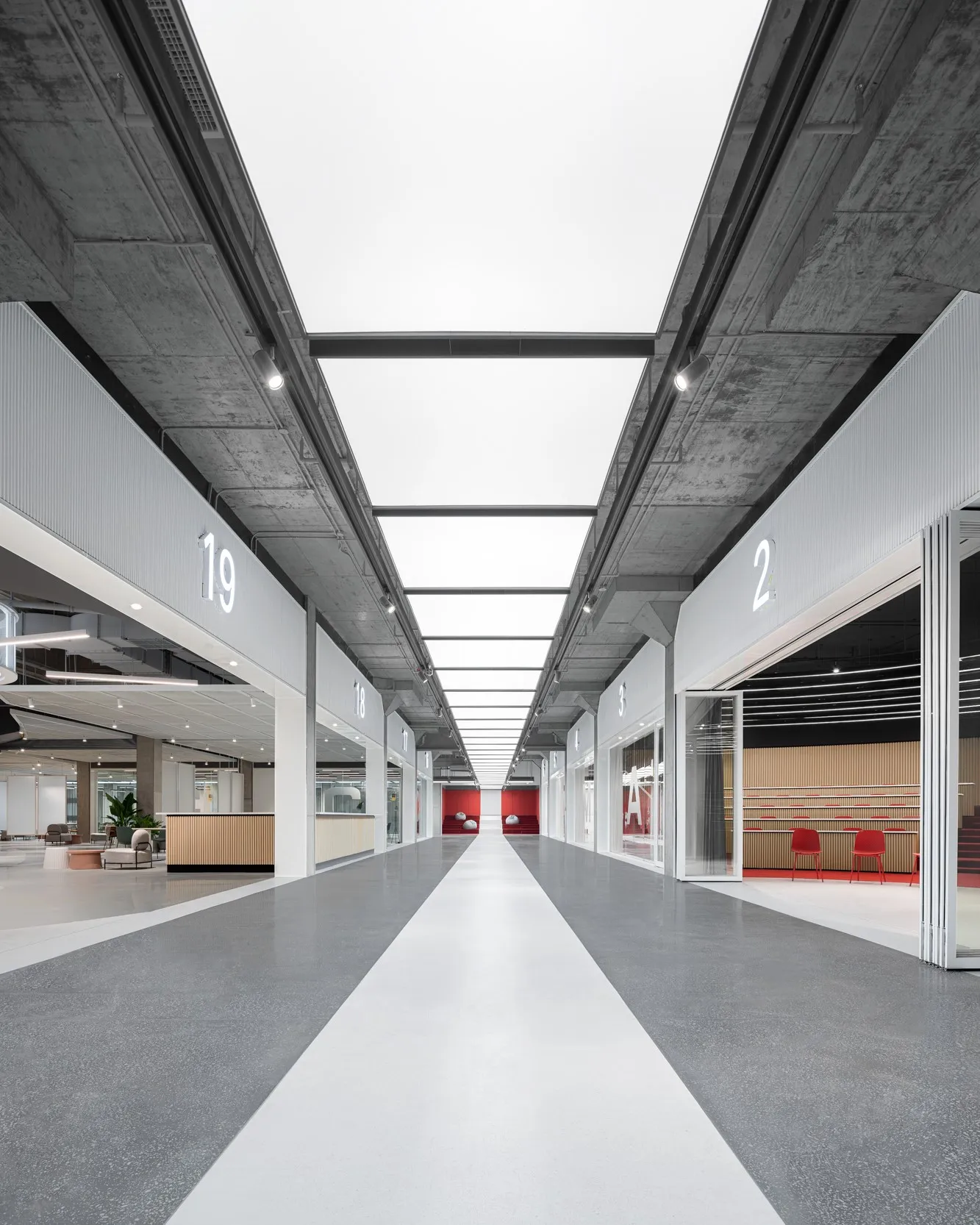 Nearly all applied design strategies in this project we meant as a response to this challenge. Firstly Superimpose chose to apply the concept of an arcade to this project. Typically with this architectural typology, integrated roof lights along a linear space let in natural daylight. In the design of the conference center, two linear floating volumes of light that mimic the color of natural daylight resemble this situation.