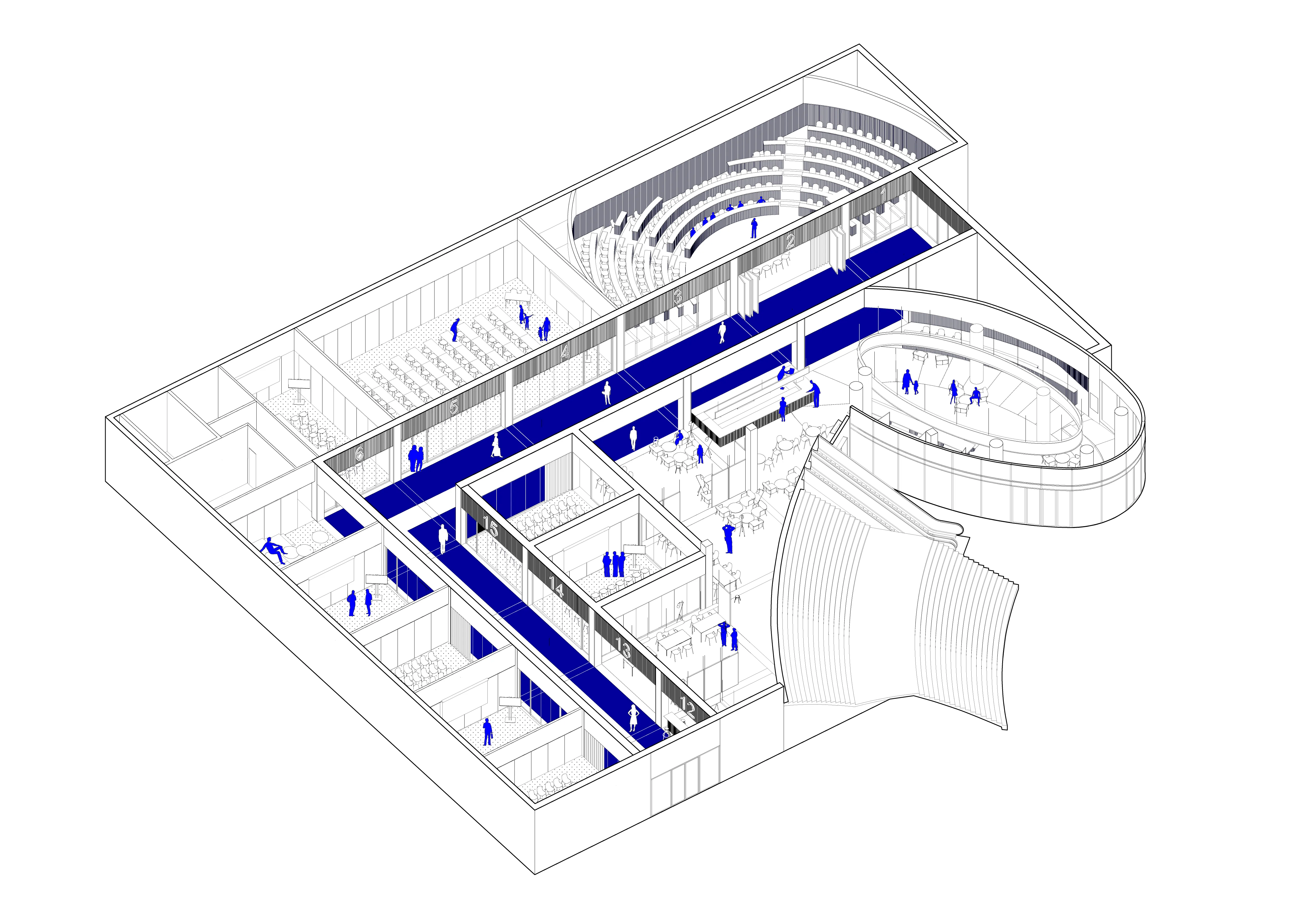When entering the conference center, this visitor will instantlynotice another element meant as a practical solution to the dark nature of the basement. A large floating oval shape has various types of integrated light sources that help in making the transition from outside to inside easier for the eye. The reception area doesn’t boost many furniture pieces to make it easily convertible to an event space. Daylight coming from the adjacent sunken courtyard spreads through the basement more easily by keeping the ceiling open and exposed. Lastly, programmatic functions such as an area called ‘the living room’ and a coffee bar are added in a communal open space in order to provide a comfortable place for working and spending the day.