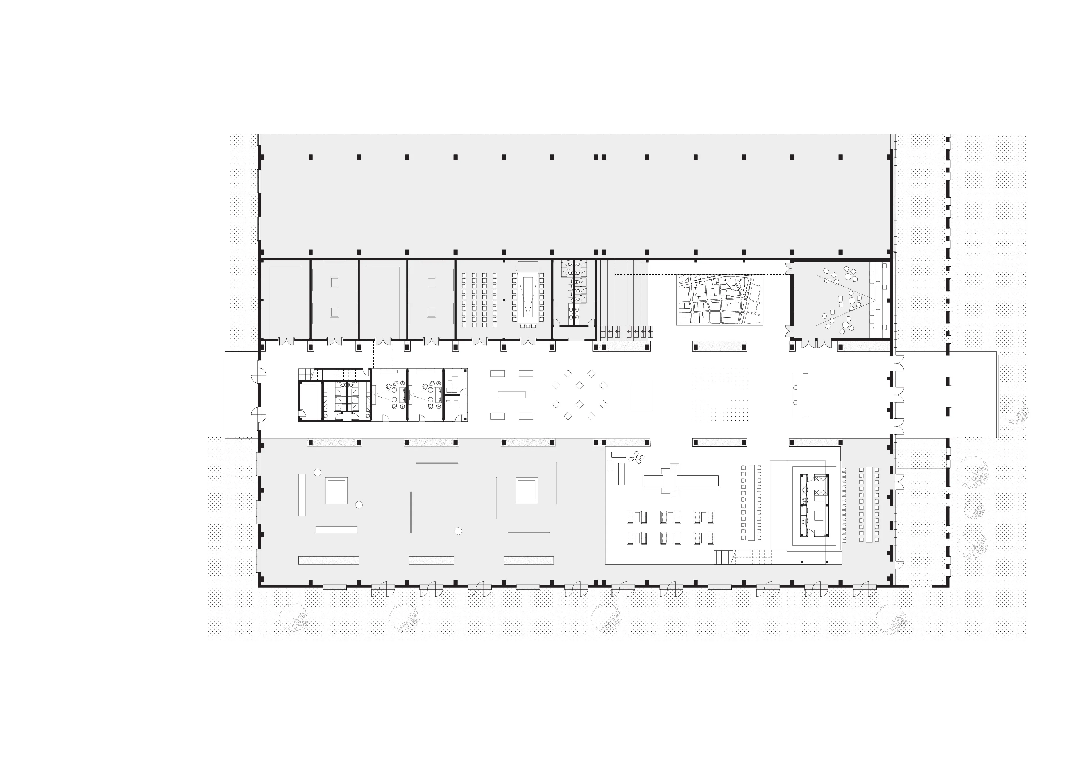 The original load bearing factoryfaçade was concealed by an office extension on the east side of the factory that had a comparatively denser grid wall structure. Superimpose the proposed averanda by removing all the interior subdivisions of the extension, revealing the original factory façade and made this into the main entrance of the Exhibition Centre. The essence of the extension is kept by framing the original w indows and doors without any infill. The glass roof veranda offers an equential arrival space, which pronounces the main entrance and promotes accessibility.