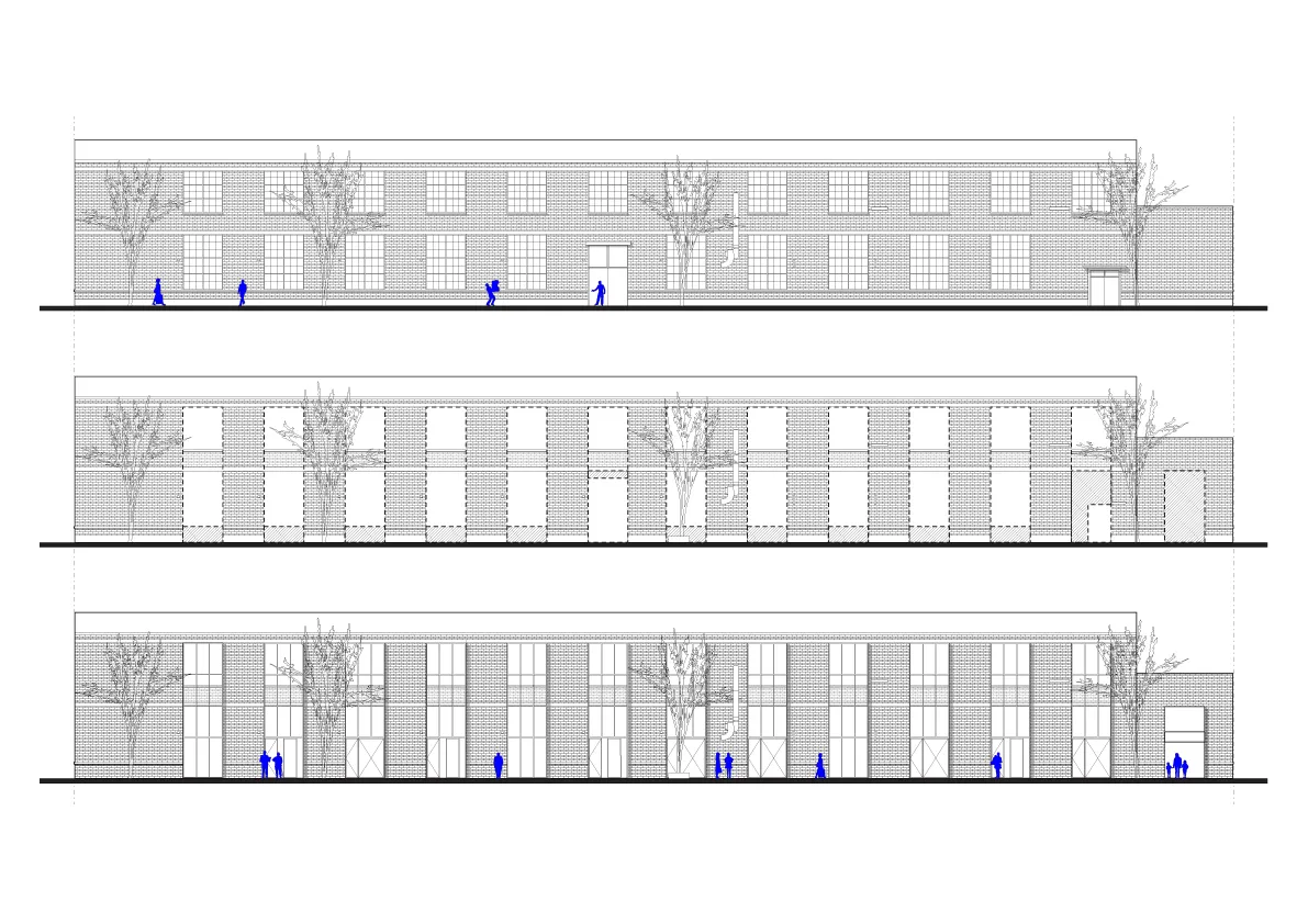 Key features of the factory arethe repetitive structural frames, the unique and wall-painted propaganda slogans, and rhythmic façade openings. The original brick façade is robust, rhythmic and designed for industrial purposes. To adapt and accommodate the current needs, a level of intervention is introduced to the facade.