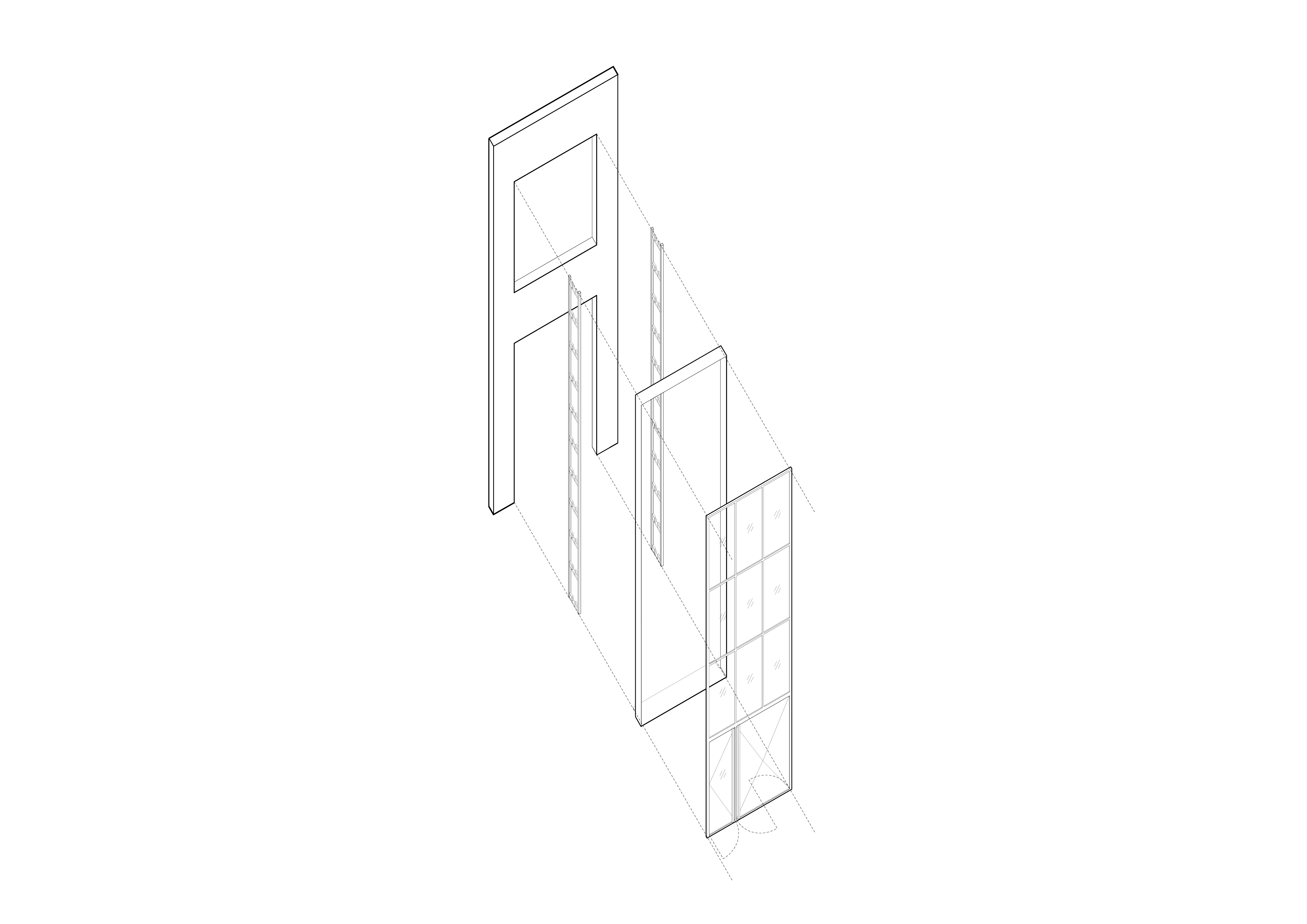 The repetitive nature of the Southfaçade is emphasised by replacement of protruded black aluminium frames and clear double-glazed windows, with operable pivot doors for outdoor events.