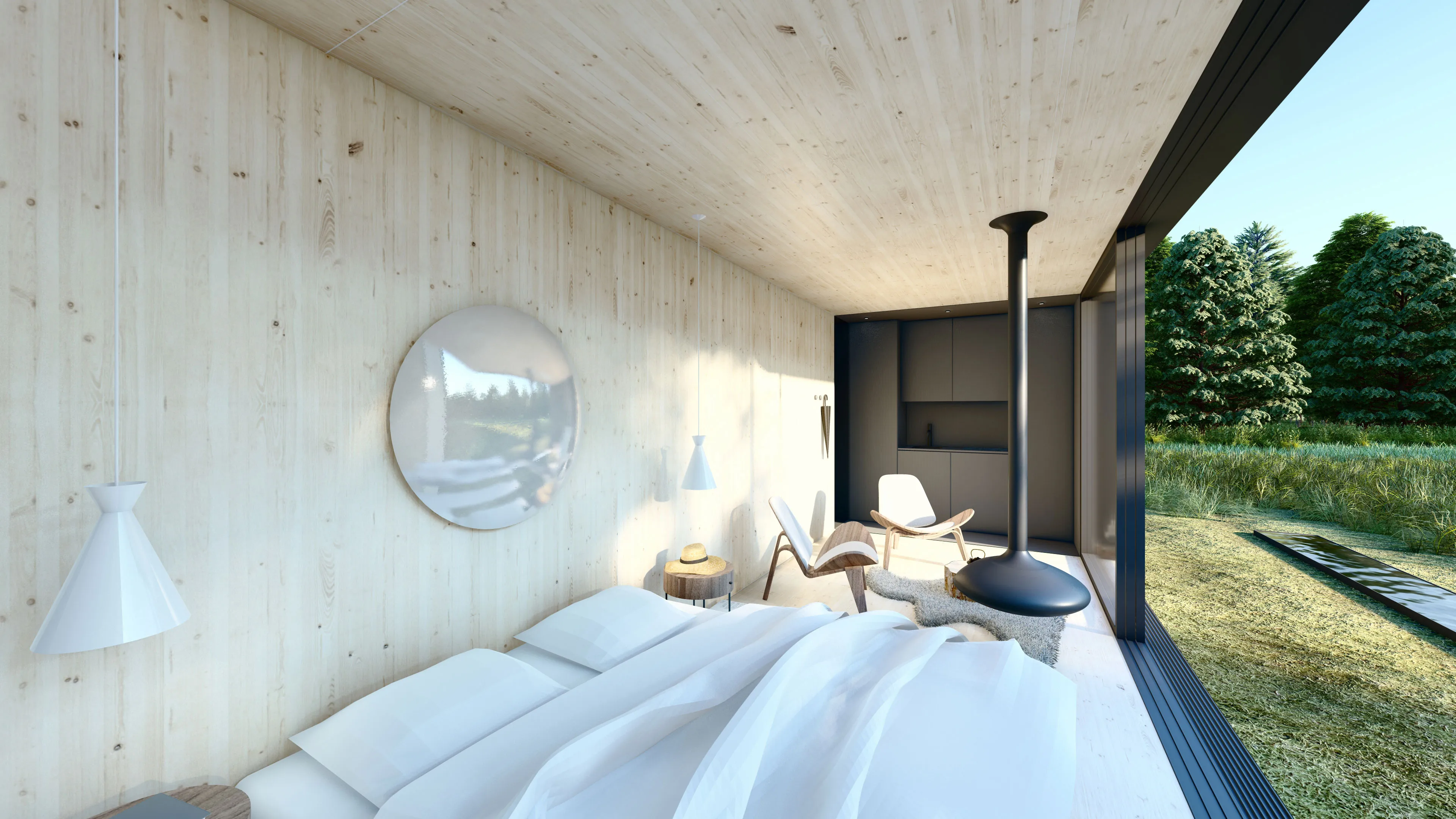 The glass sliding door facade is being contrasted by the aforementioned porous brick façade, which refers to the scale, repetition and shapes of the surrounding trees in the forest behind the pavilion. The brick facade is designed with the concept of a ‘Nest Façade’, giving place to a variety of animals and insects living in the forest such as birds, insects, and bats but also to small plants. With this concept Superimpose contrasts with the idea of nature making place for architecture. Instead nature can take over the building over time. The ‘Wildfolly’ is meant as a powerful statement, which triggers and fools the perception of the B&B guests - where nothing is what it seems.