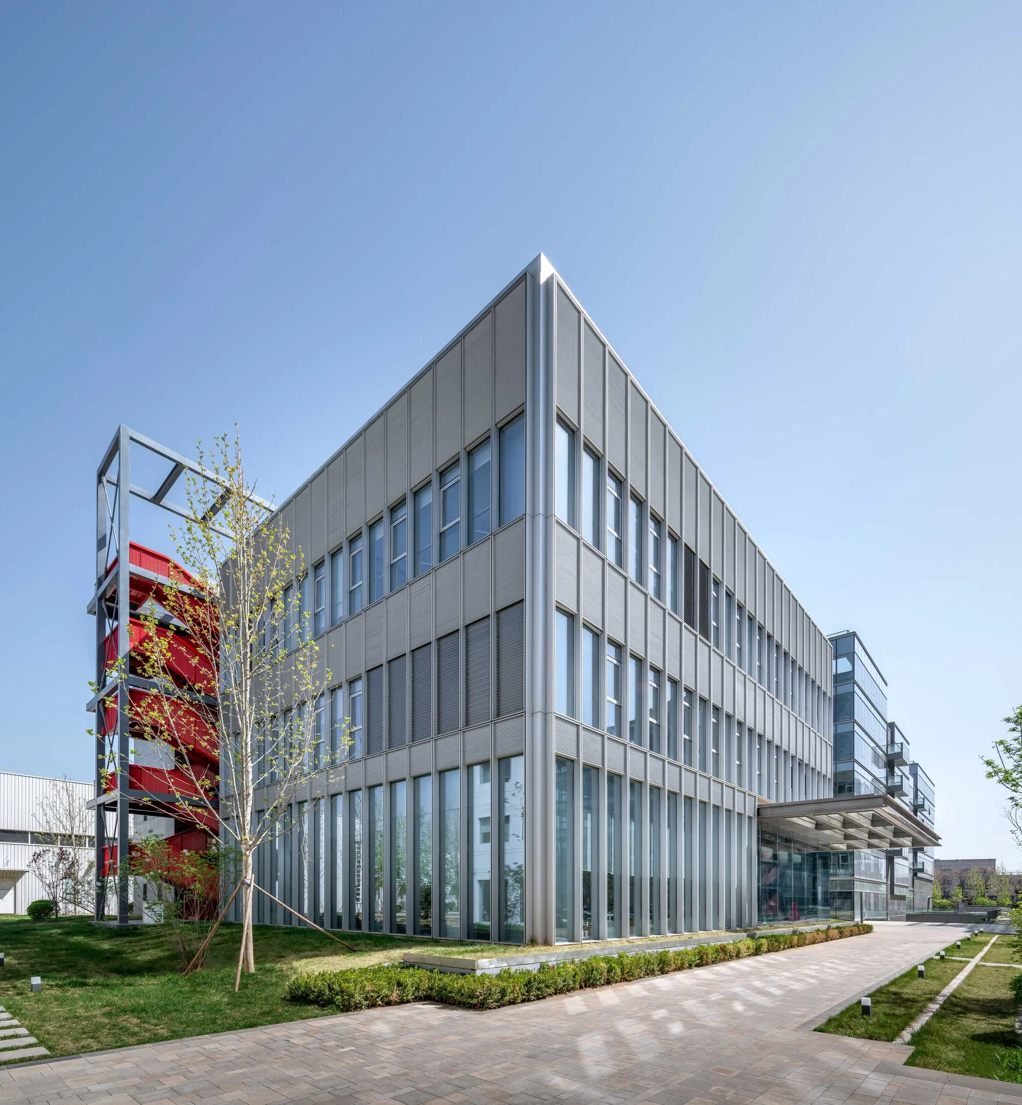 Superimpose designed the building’s façade as a cassette system to allow for adaptability whilst maintaining a strong and recognizable architectural feature that fits into Shunyi’s industrial context. Internal blinds, external blinds and electrochromic glass for an on-demand variety of shading and glass color are integrated within these façade cassettes. The entrance canopy offers shelter and provides an entrance gesture. It directly connects to the outdoor staircase whilst allowing for daylight to the groundfloor. On the rooftop, there is a fully rotatable laboratory for comprehensive sunlight related research, together with a rooftop-farm to promote nourishment and a sense of participation.
