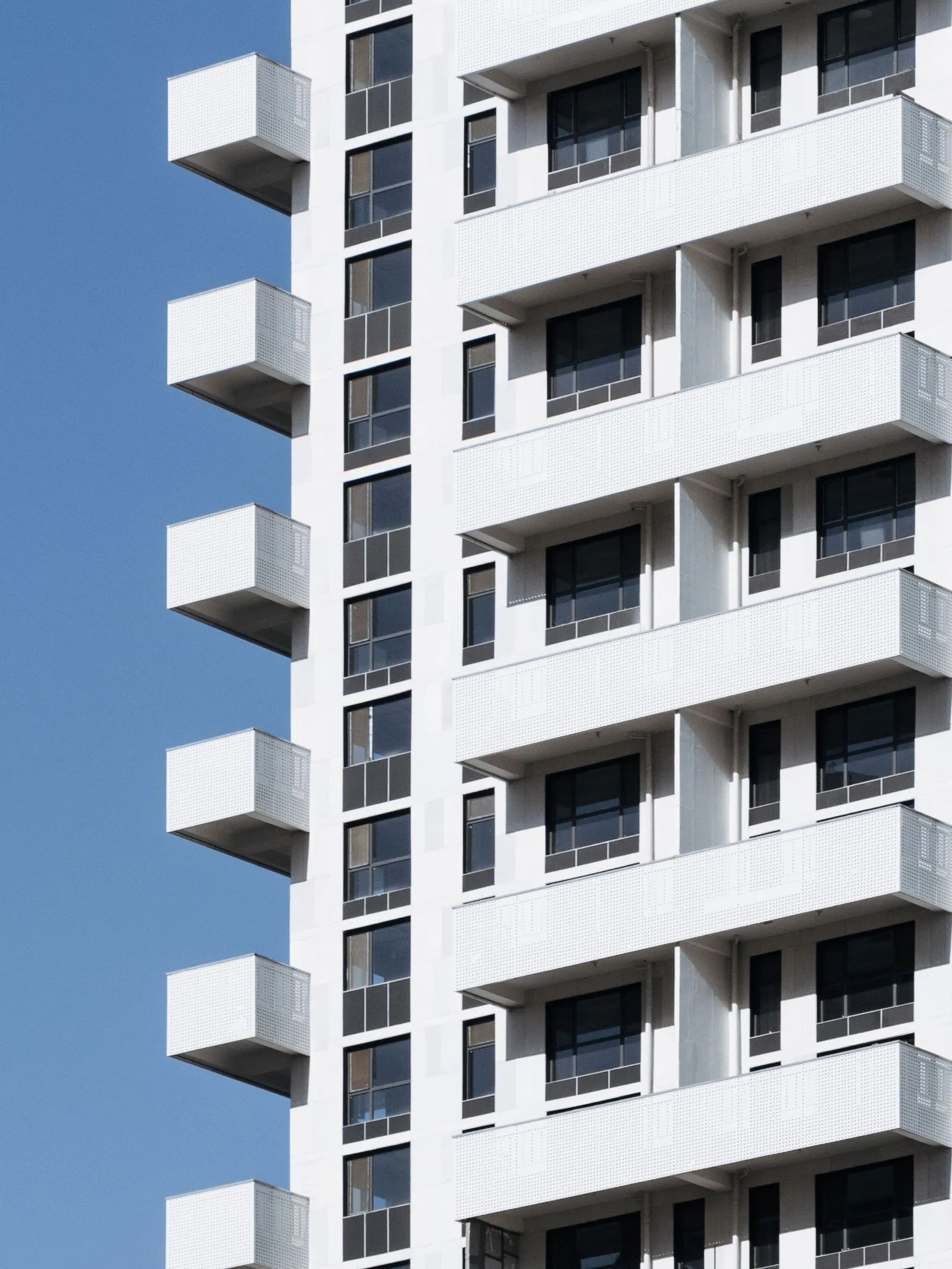 Keeping the construction budget low was key to achieving an inexpensive and affordable development for the Y-generation. By using the balconies as sculptural elements, the project could refrain from expensive façade materials and from poorly detailed façade beautifications often seen in surrounding developments. Instead Superimpose opted for a simple yet refined material palette of white facades with contrasting dark aluminum window frames and panels, together with slightly reflective glass. The balconies have been cladded with white perforated aluminum.